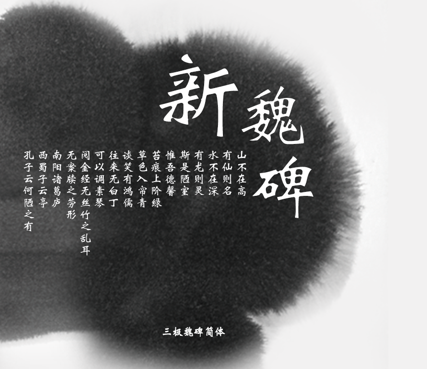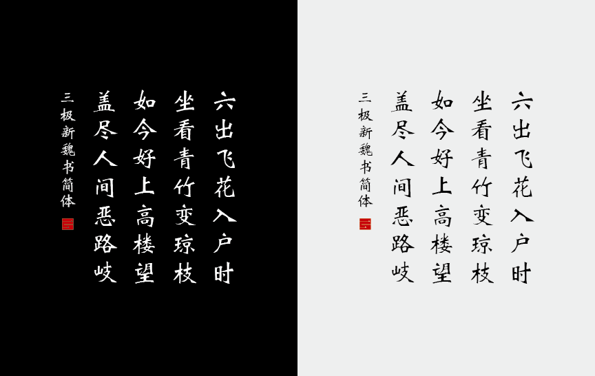 三极新魏碑简以魏碑字型为本,笔画细致流畅,结构紧凑,笔意拙中带巧,不避锋芒。充分体现了汉晋隶书与唐楷之变化,字形笔意尽显。适用于各类便携式屏幕的系统嵌入字体,以及传统印刷媒介的标题与正文排版。在品牌形象设计中作为logo设计性文字视觉效果更佳。