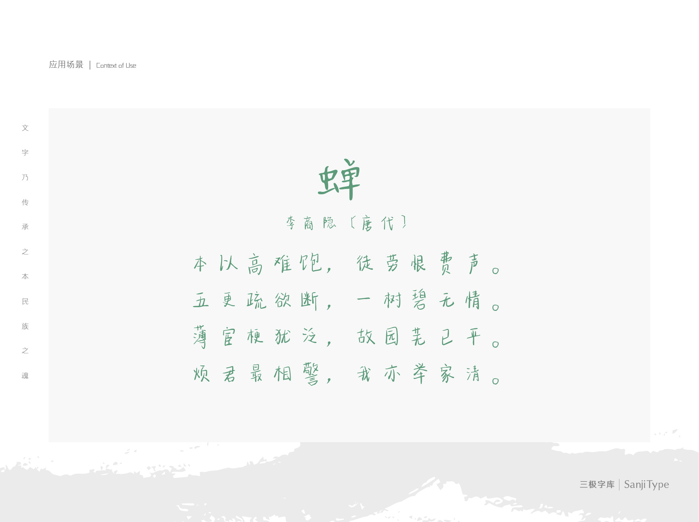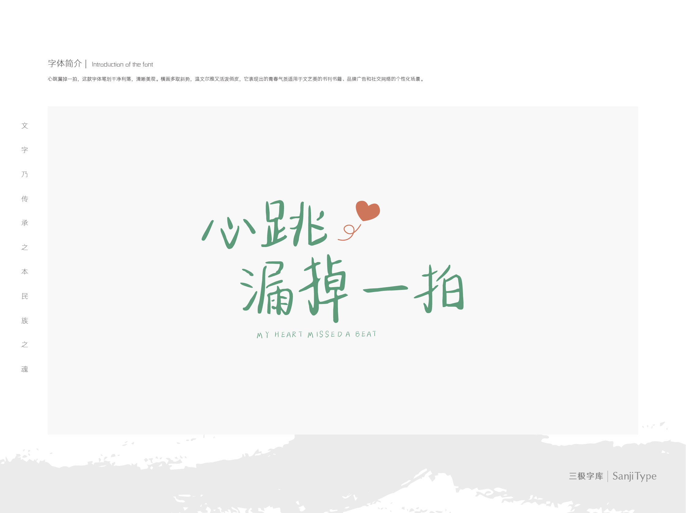 心跳漏掉一拍,这款字体笔划干净利落,清晰美观。横画多取斜势,温文尔雅又活泼俏皮,它表现出的青春气质适用于文艺类的书刊书籍、品牌广告和社交网络的个性化场景。