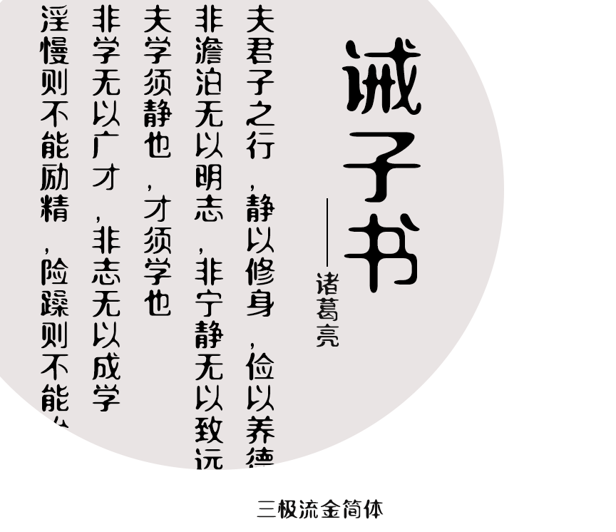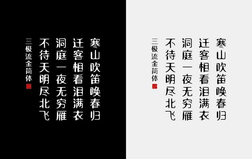 三极鎏金简体,这款字体最初的构想来源于毛笔字墨水不均、被水滴晕开后的样子。它由曲线所构成,笔画与笔画衔接处大多为圆角,且呈现水滴镏金状,带有古典、质朴的气息。笔画底层结构源于黑体,丰富了目前市面上黑体的表现形式。适用于杂志读物、宣传册、品牌广告、包装设计以及社交网络个性化用字。