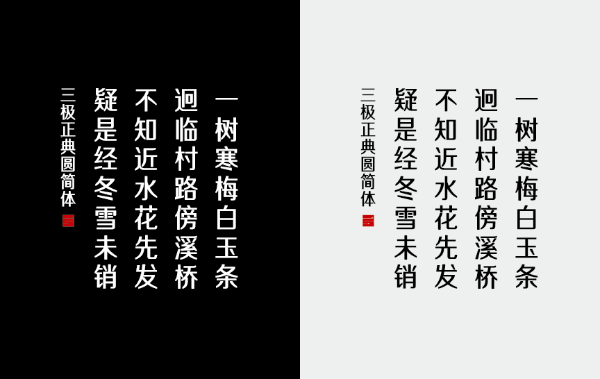 三极正典圆简体,整体风格鲜明大气,字体结构有意偏窄纤瘦。笔画平直收笔圆弧彰显优雅,圆角转折,外方内圆。适用于传统印刷媒介的标题与正文排版、各类屏幕显示及影视字幕等。