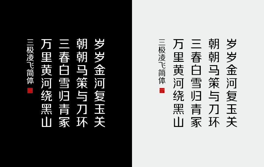 三极凌飞简体创意来自于铅笔尖头的外形,字形利落,结构严谨,起笔收笔都为斜角截断,体现速度感。特征明显,整齐中赋予变化,易读性强。适用于杂志读物、宣传册、品牌广告、包装设计以及社交网络个性化用字。
