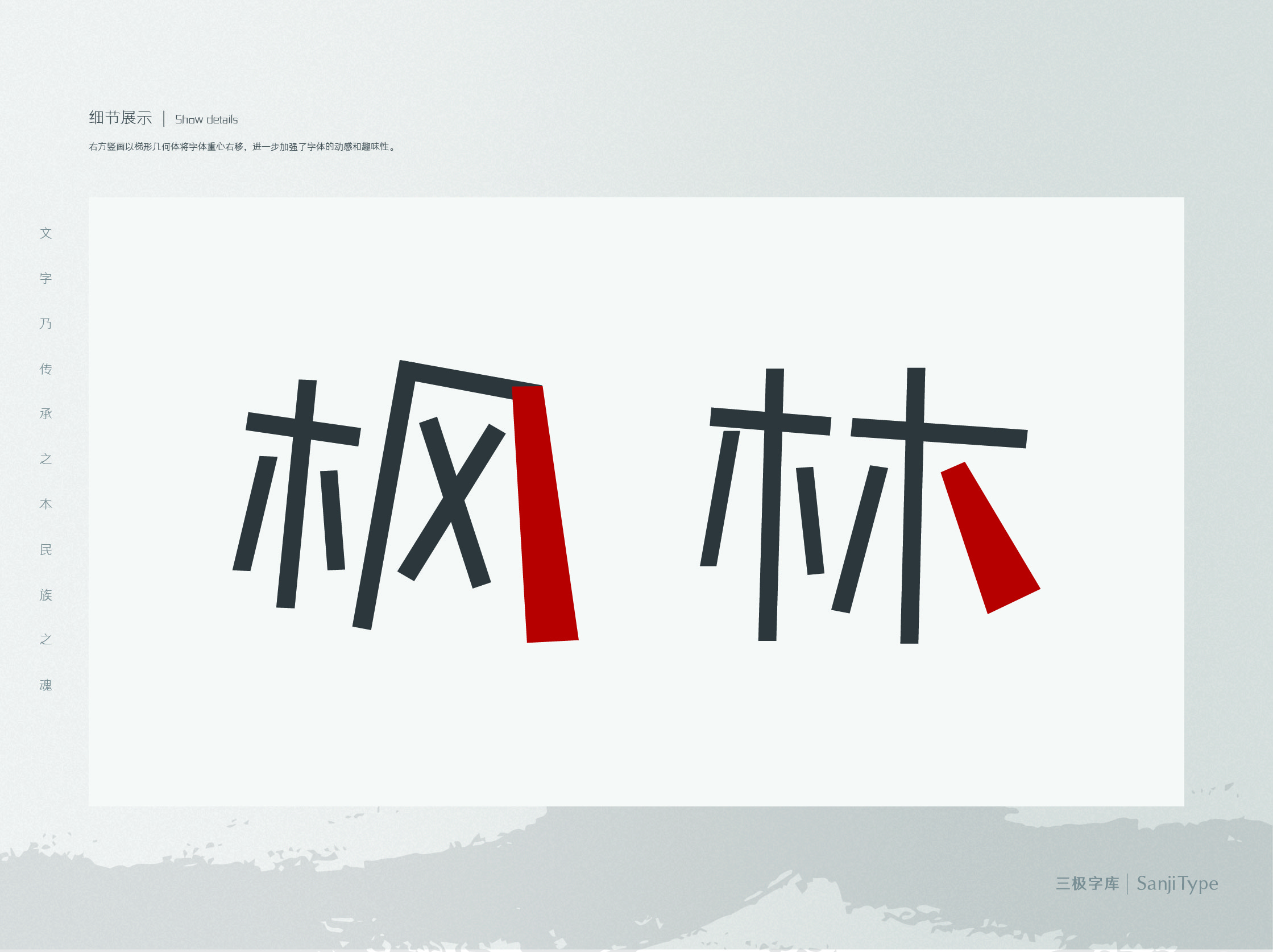 三极枫林简体共包含四款自重,歪斜的角度、笔画粗重感不一、可爱中带着顽皮捣蛋。适用于搞怪、童趣以及万圣节主题中,能够表现出画面趣味、可爱之感。