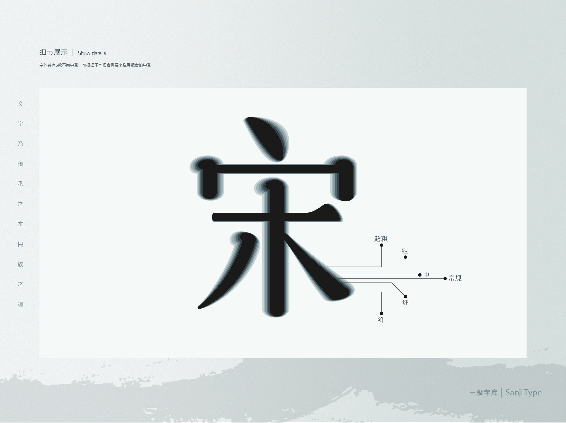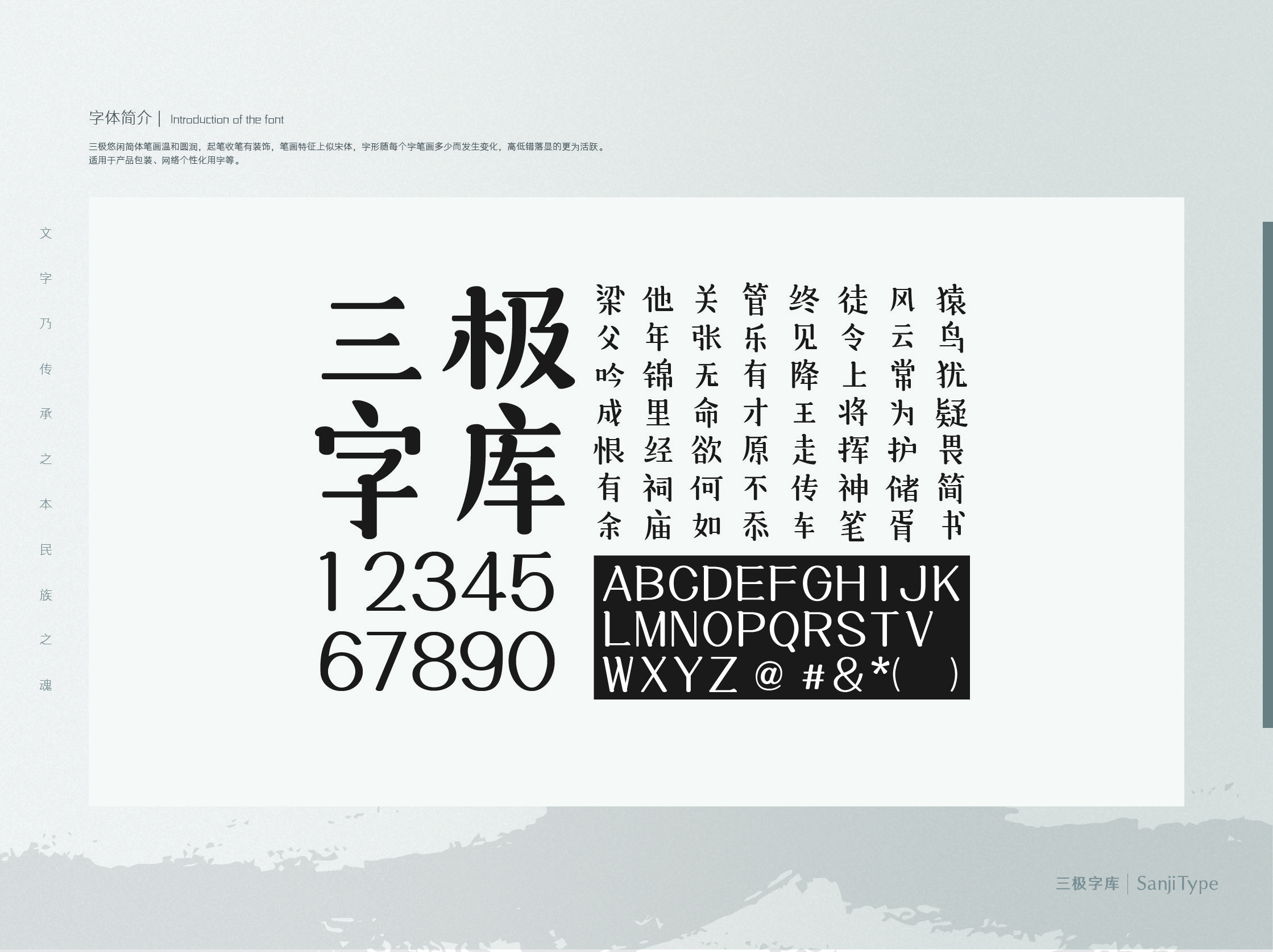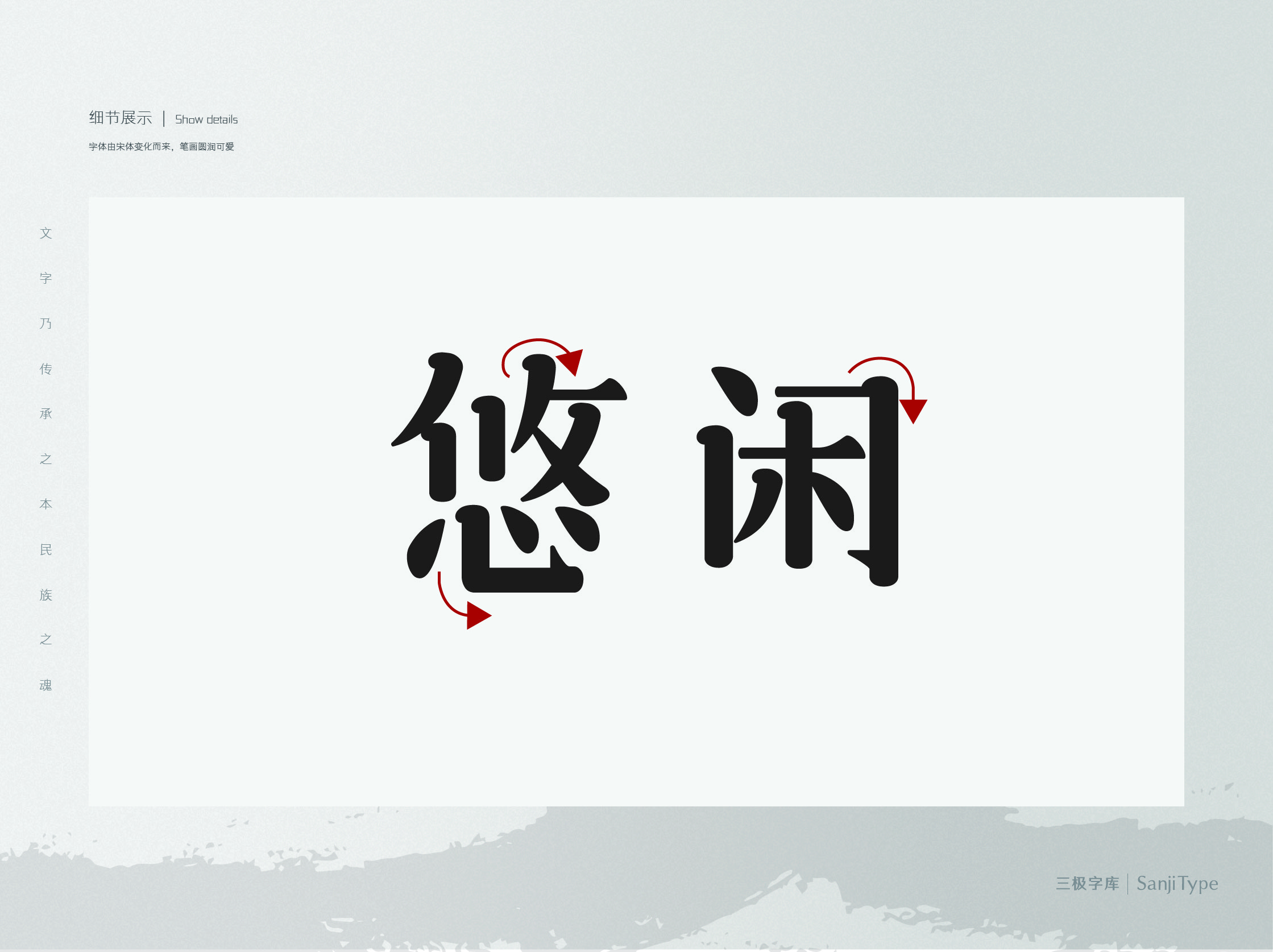 三极悠闲宋简体笔画温和圆润,起笔收笔有装饰,笔画特征上似宋体,字形随每个字笔画多少而发生变化,高低错落显的更为活跃。适用于产品包装、网络个性化用字等。