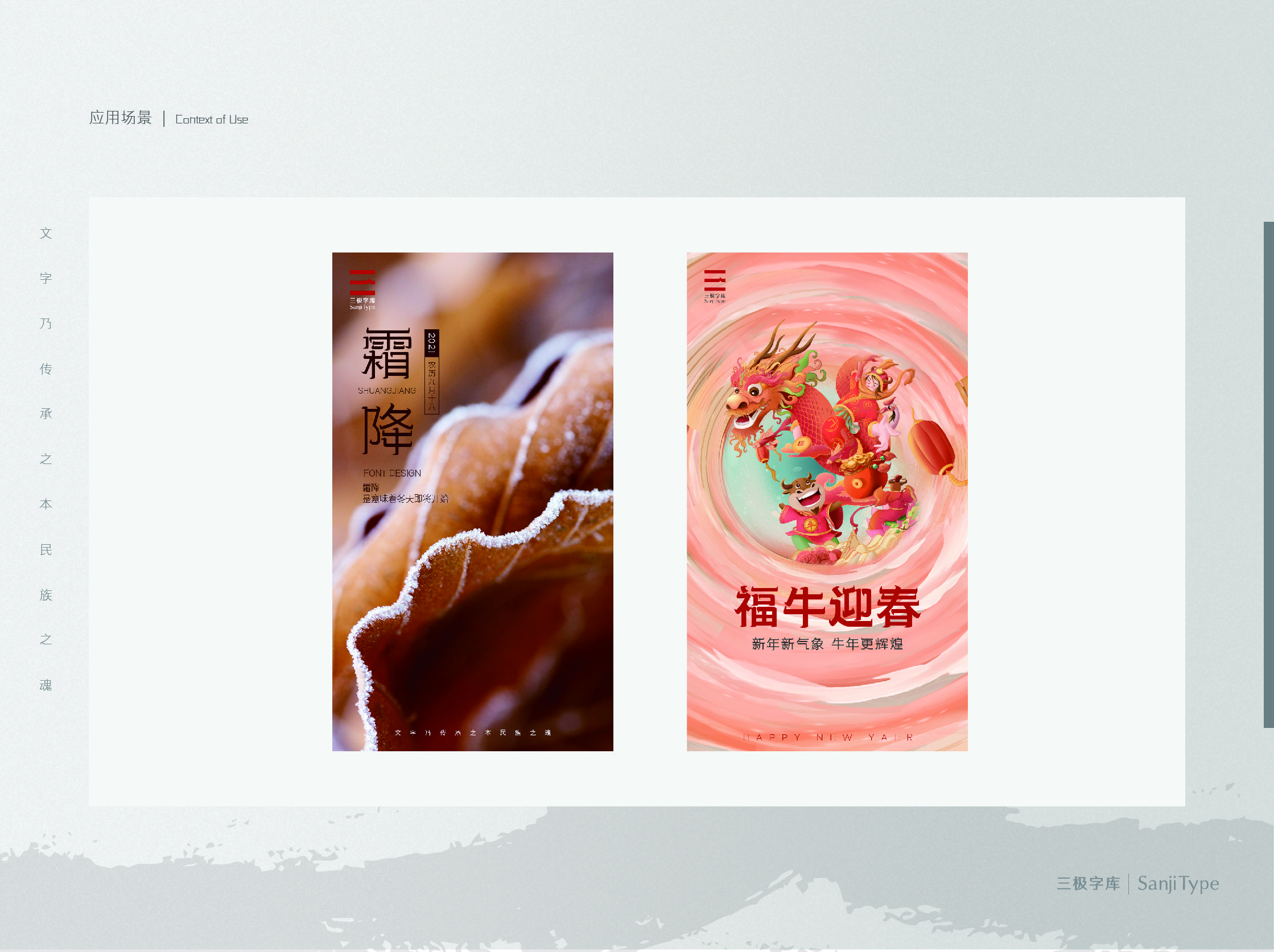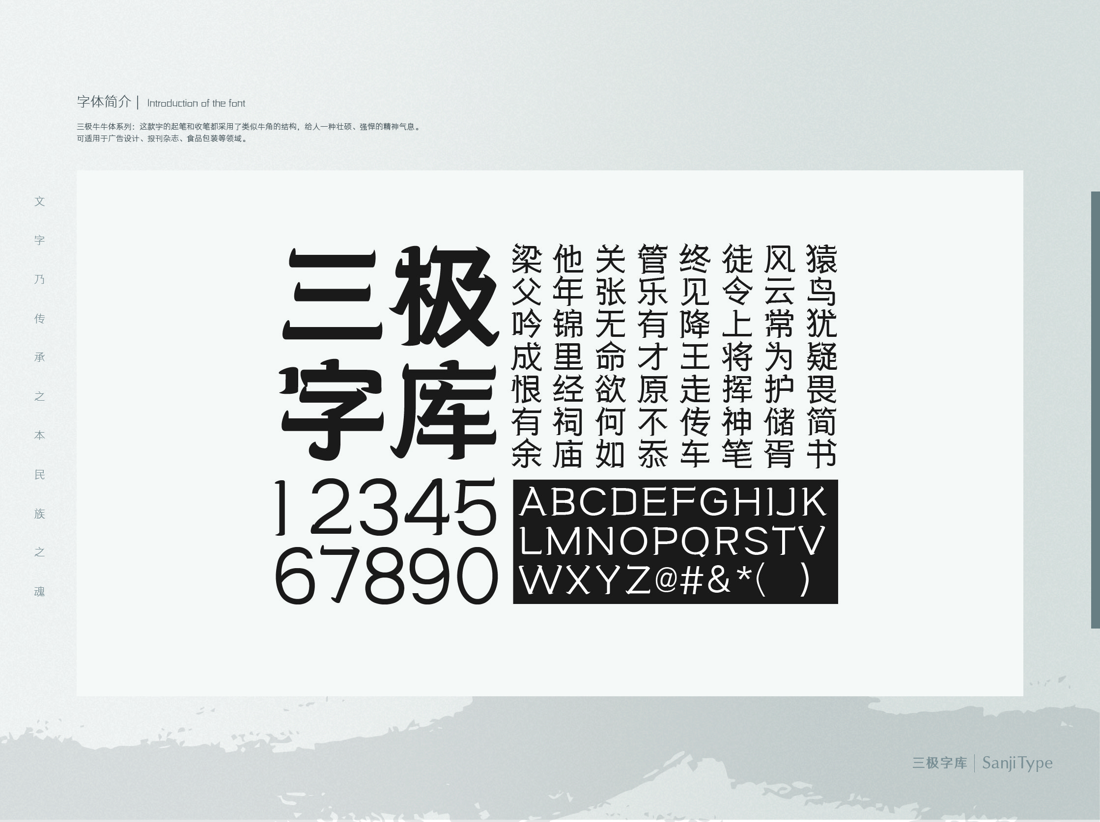 三极牛牛体系列:这款字的起笔和收笔都采用了类似牛角的结构,给人一种壮硕、强悍的精神气息。可适用于广告设计、报刊杂志、食品包装等领域。