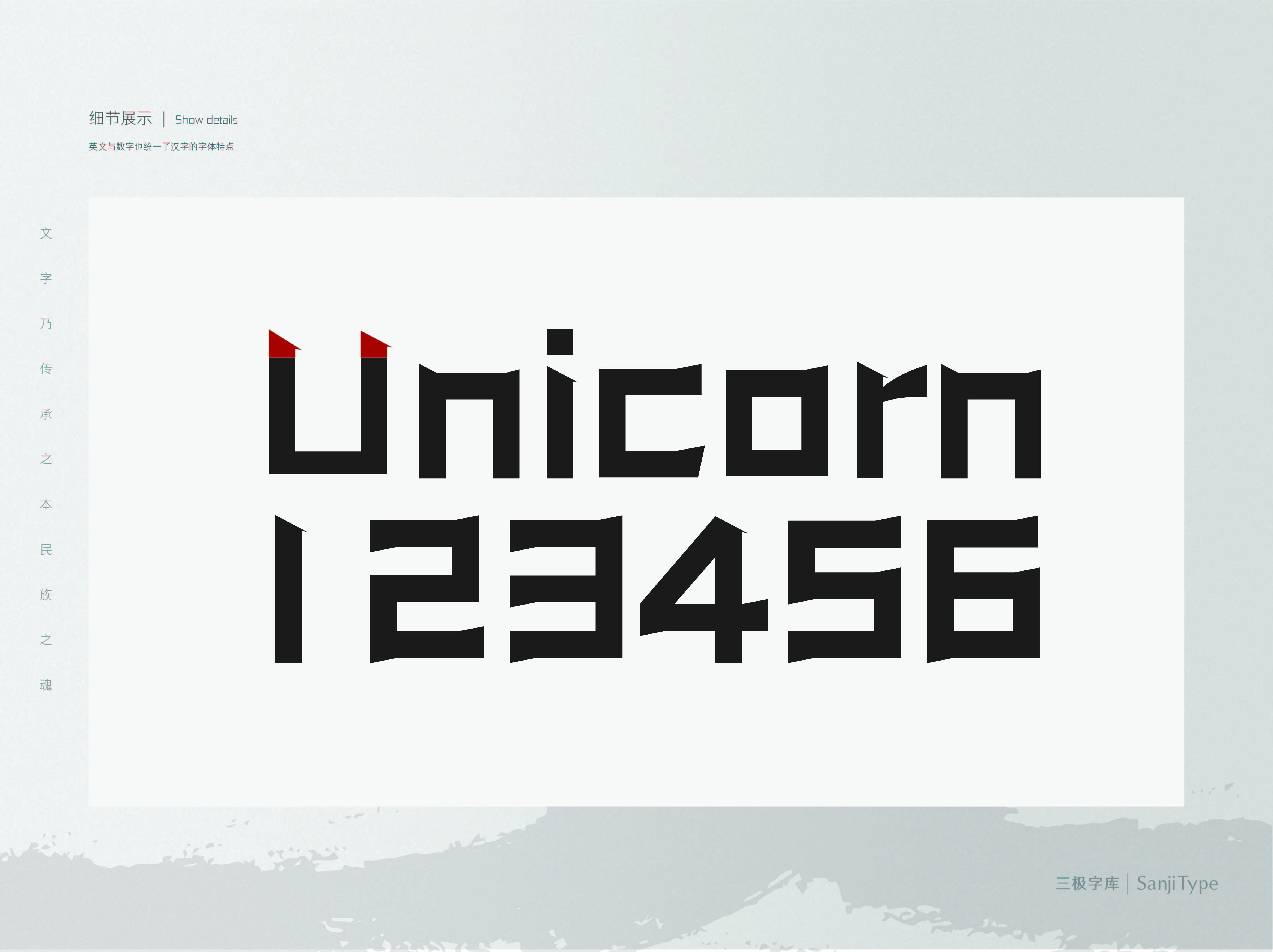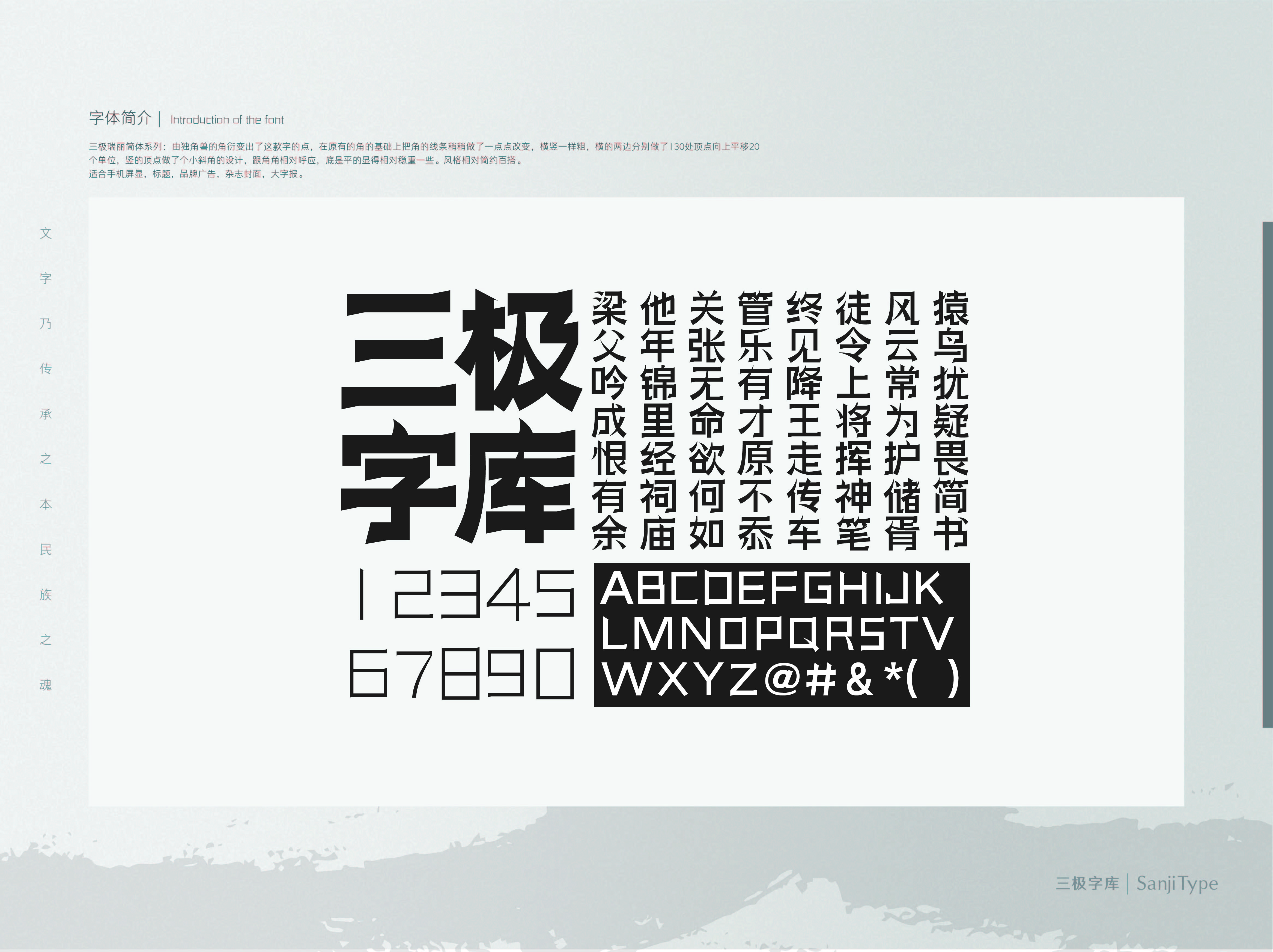 三极瑞丽简体的点笔,由独角兽的角衍变而来。在原有的角的基础上把角的线条稍稍做了改变,线条更加柔润。横竖笔画等粗,横画、竖笔添加小斜角,跟独角兽角相对呼应。为了让整体稳重一些,笔画底部是平的。风格相对简约百搭,适合手机屏显,标题,品牌广告,杂志封面,大字报。