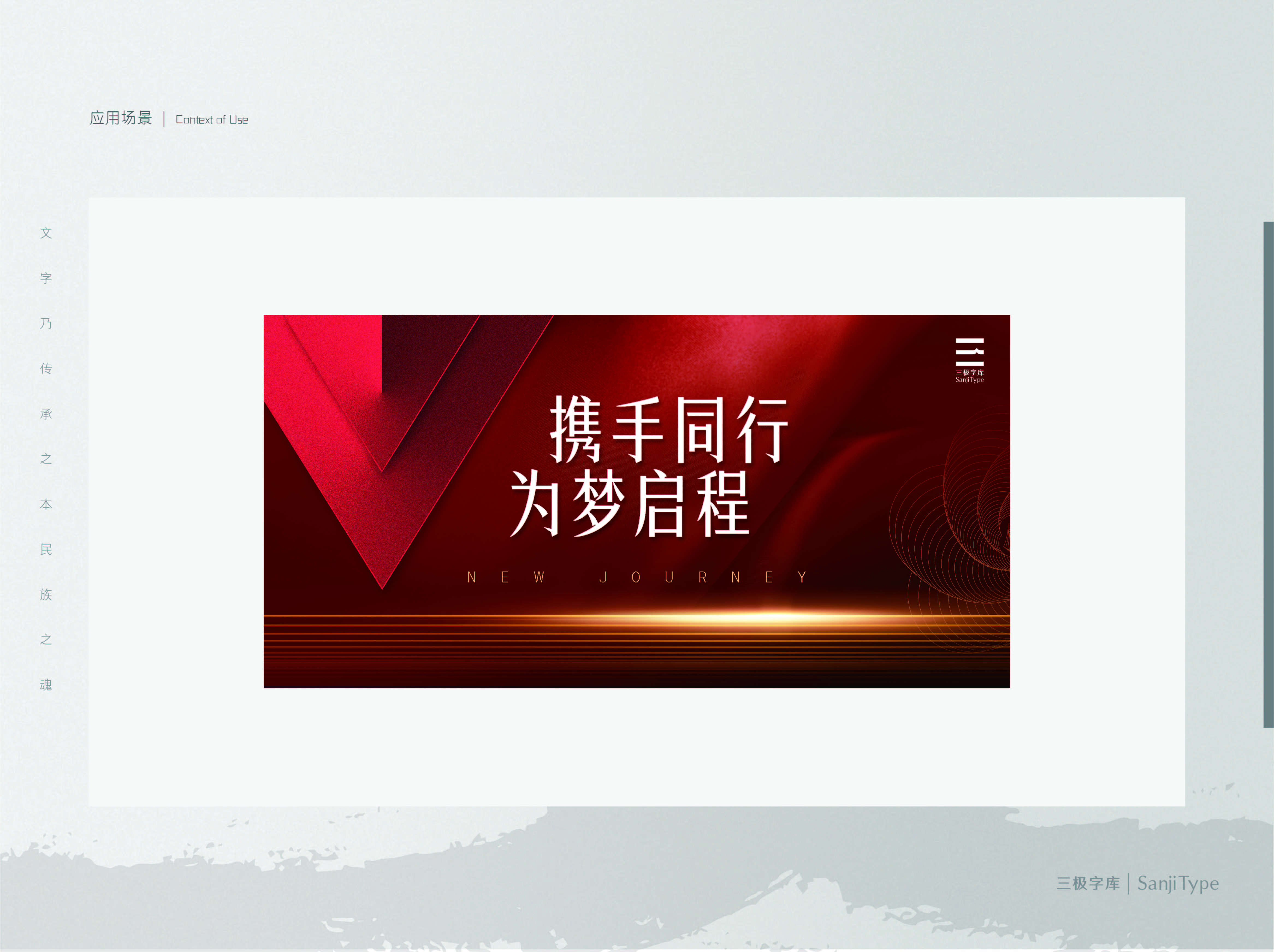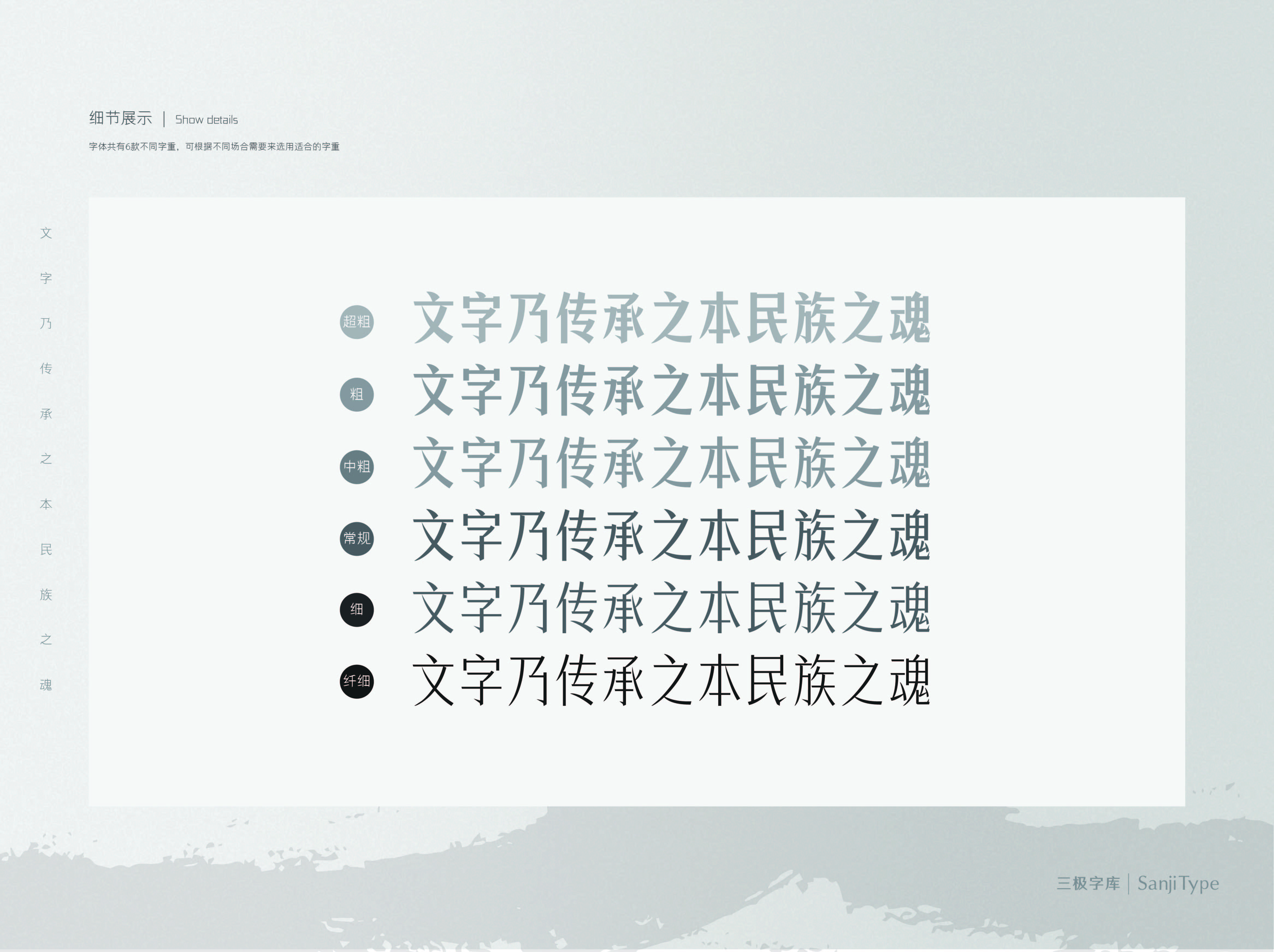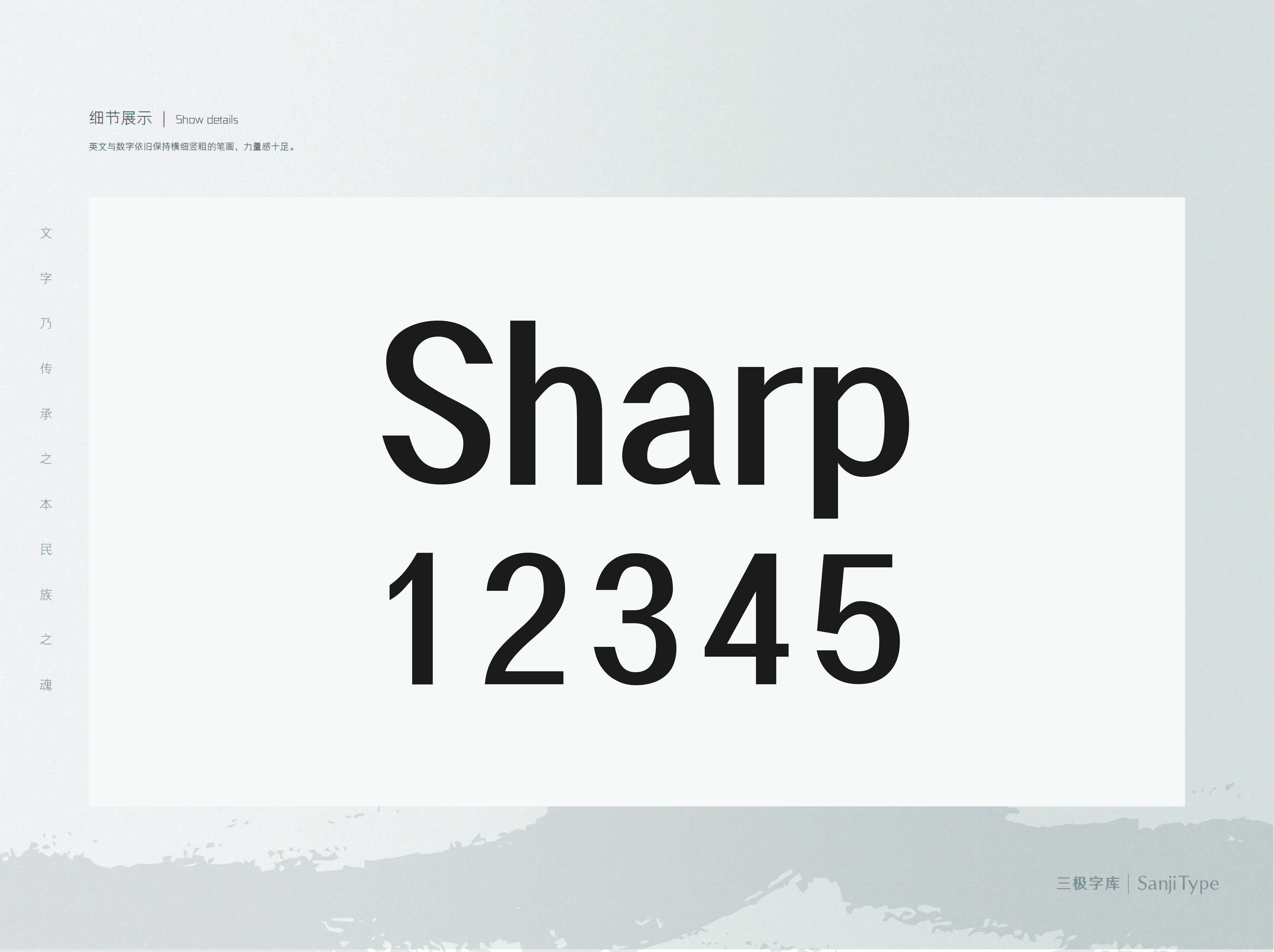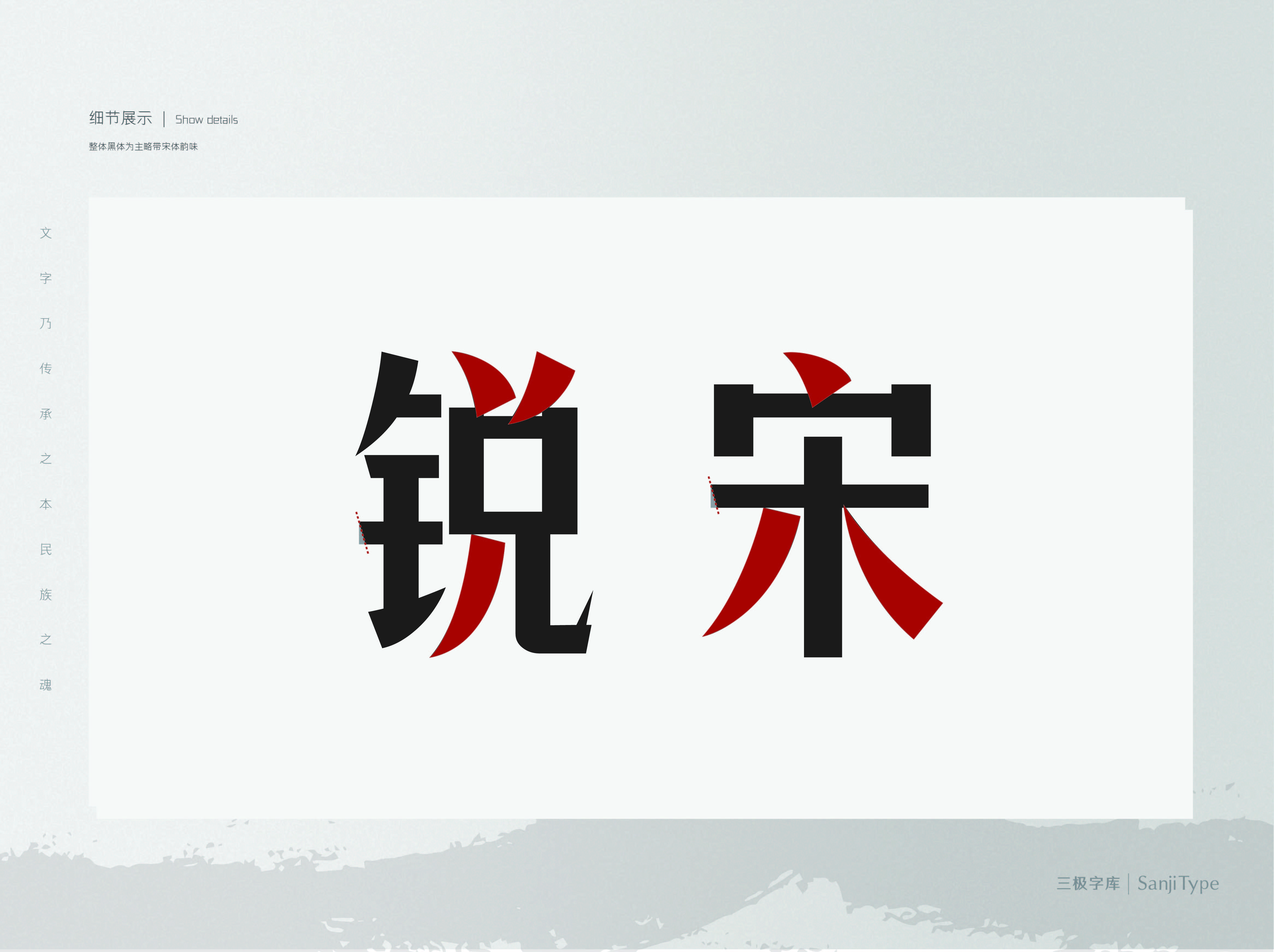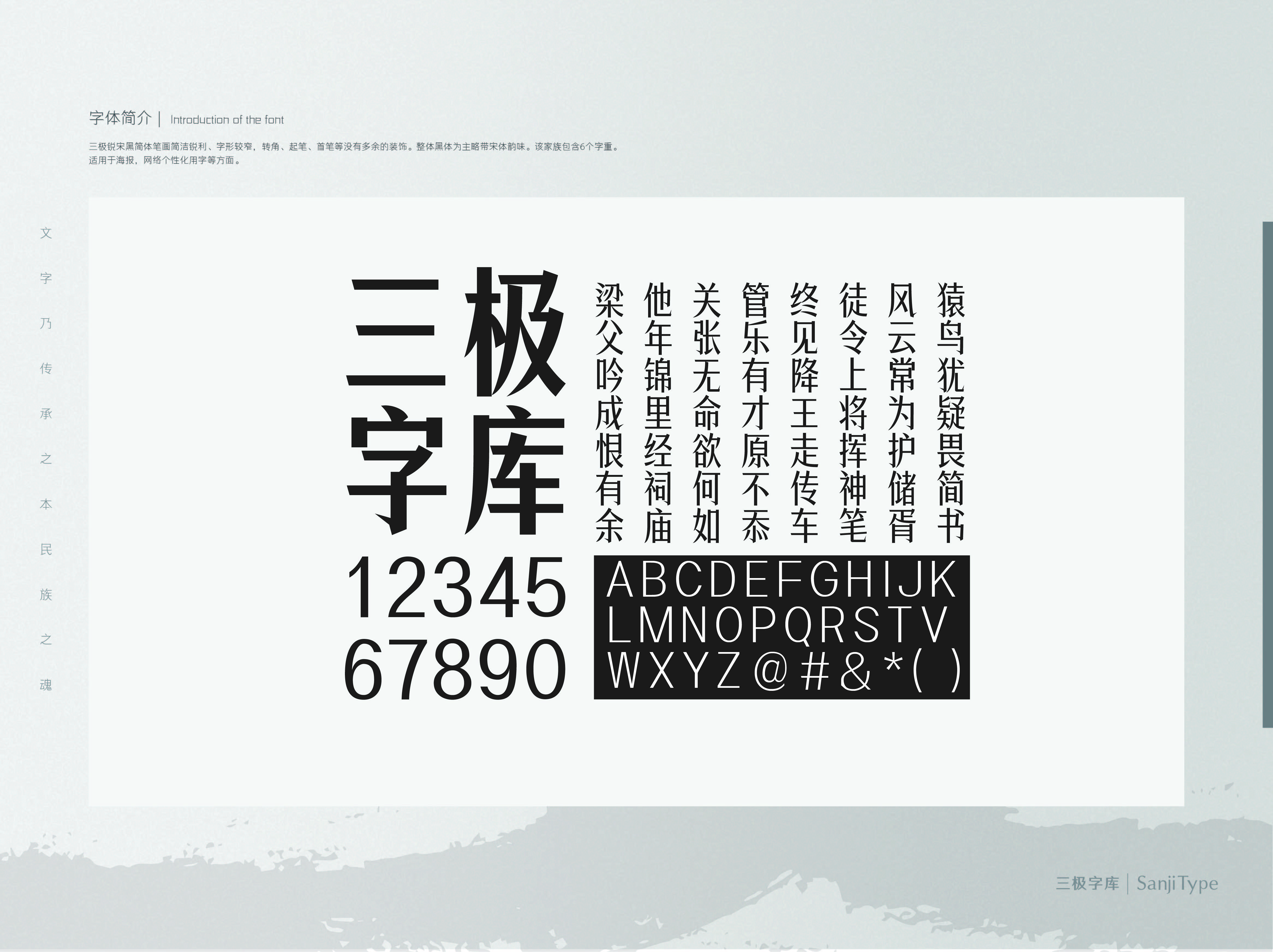 三极锐宋黑简体笔画简洁锐利、字形较窄,转角、起笔、收笔等没有多余的装饰,提笔尖锐。整体黑体为主略带宋体韵味。该家族包含6个字重,适用于海报、包装设计、网络个性化用字等。