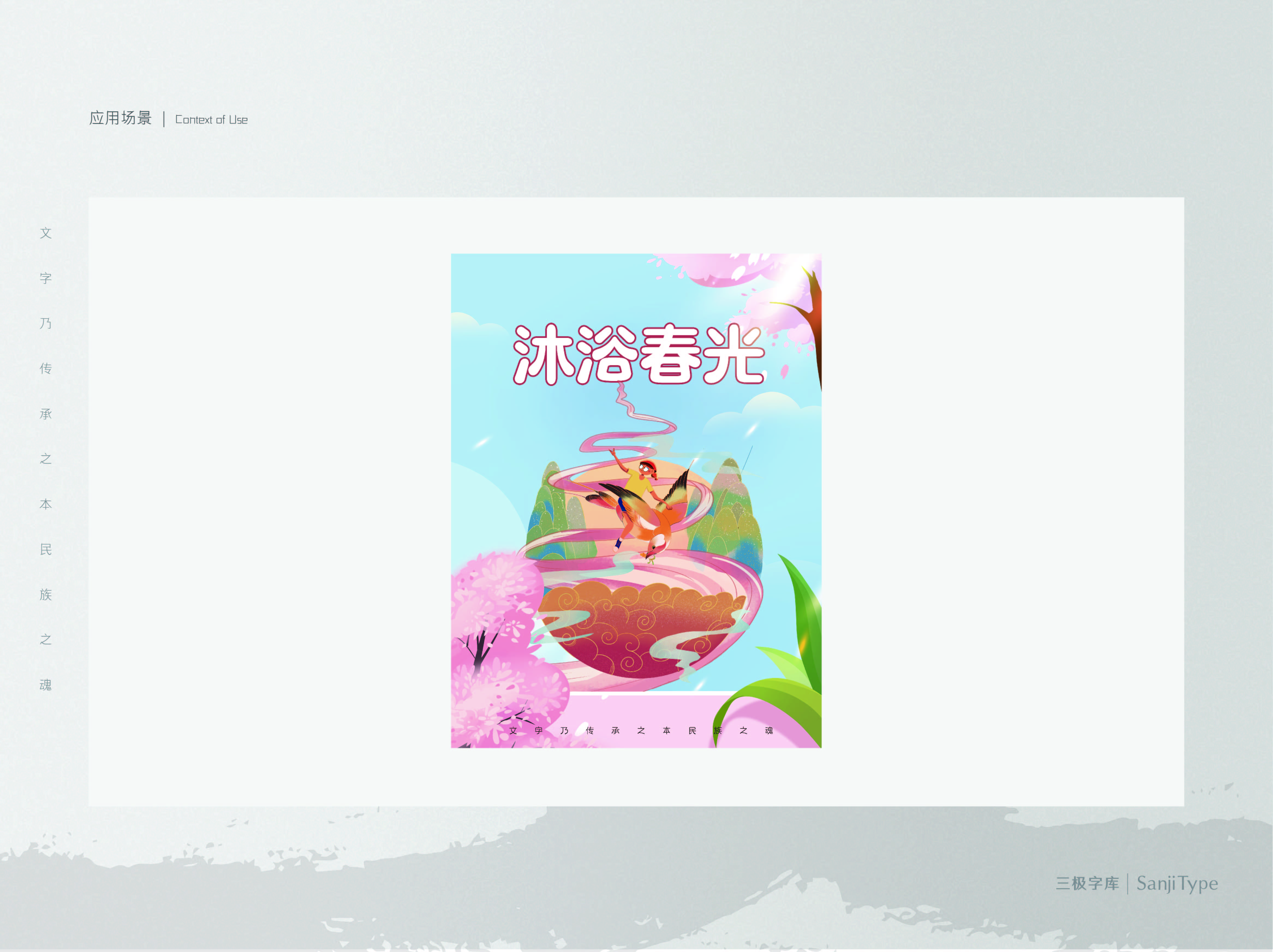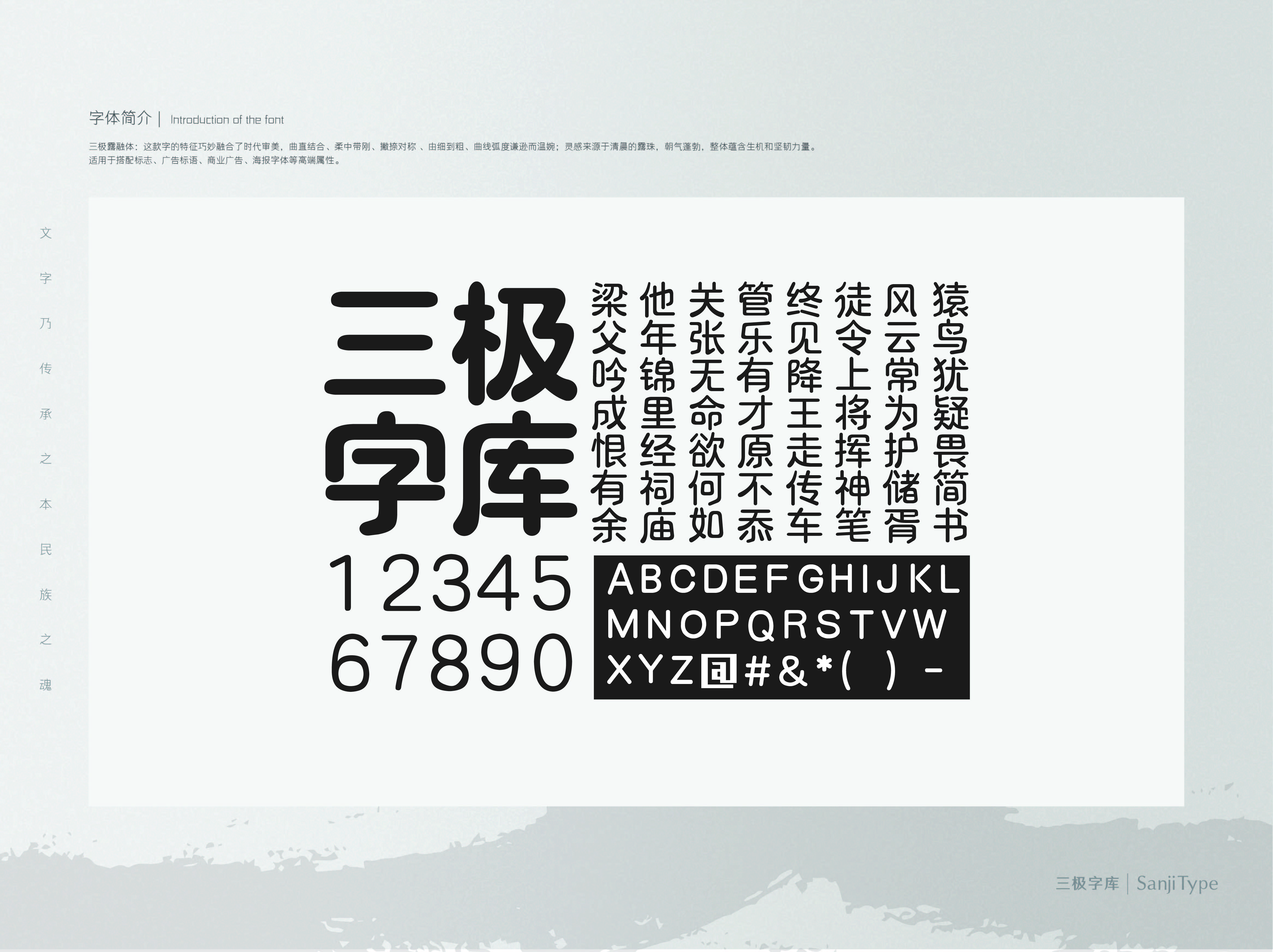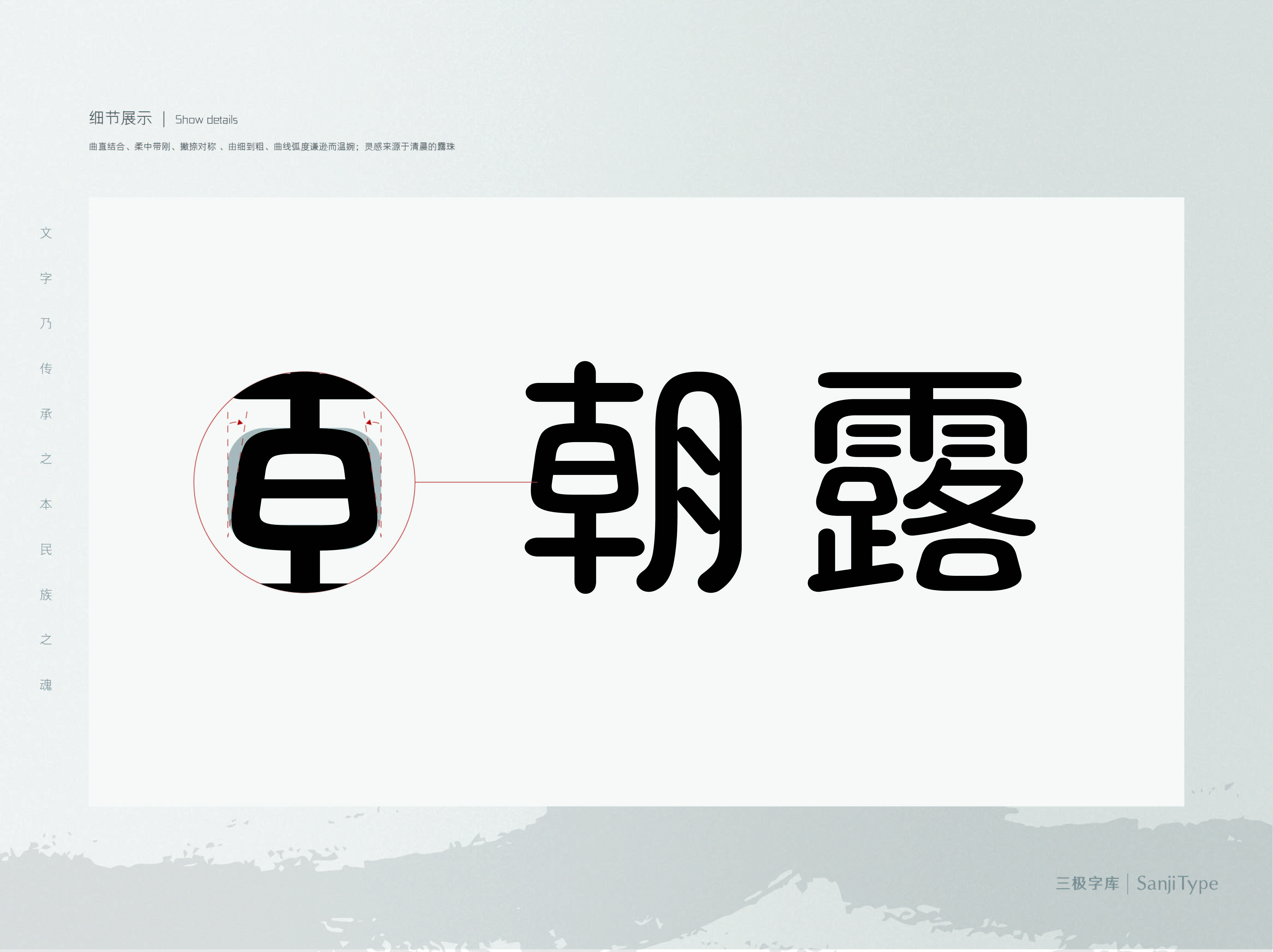 三极露融体:这款字灵感来源于清晨的露珠,部分笔画带有从细到粗的过渡变化,形似掉落的露珠。横笔连接处以负空间形式凸显俩端的露珠造型。整体朝气蓬勃,蕴含生机和坚韧力量。巧妙融合了时代审美,曲直结合、柔中带刚、曲线弧度谦逊而温婉;适用于搭配标志、广告标语、商业广告、海报字体等高端属性设计。