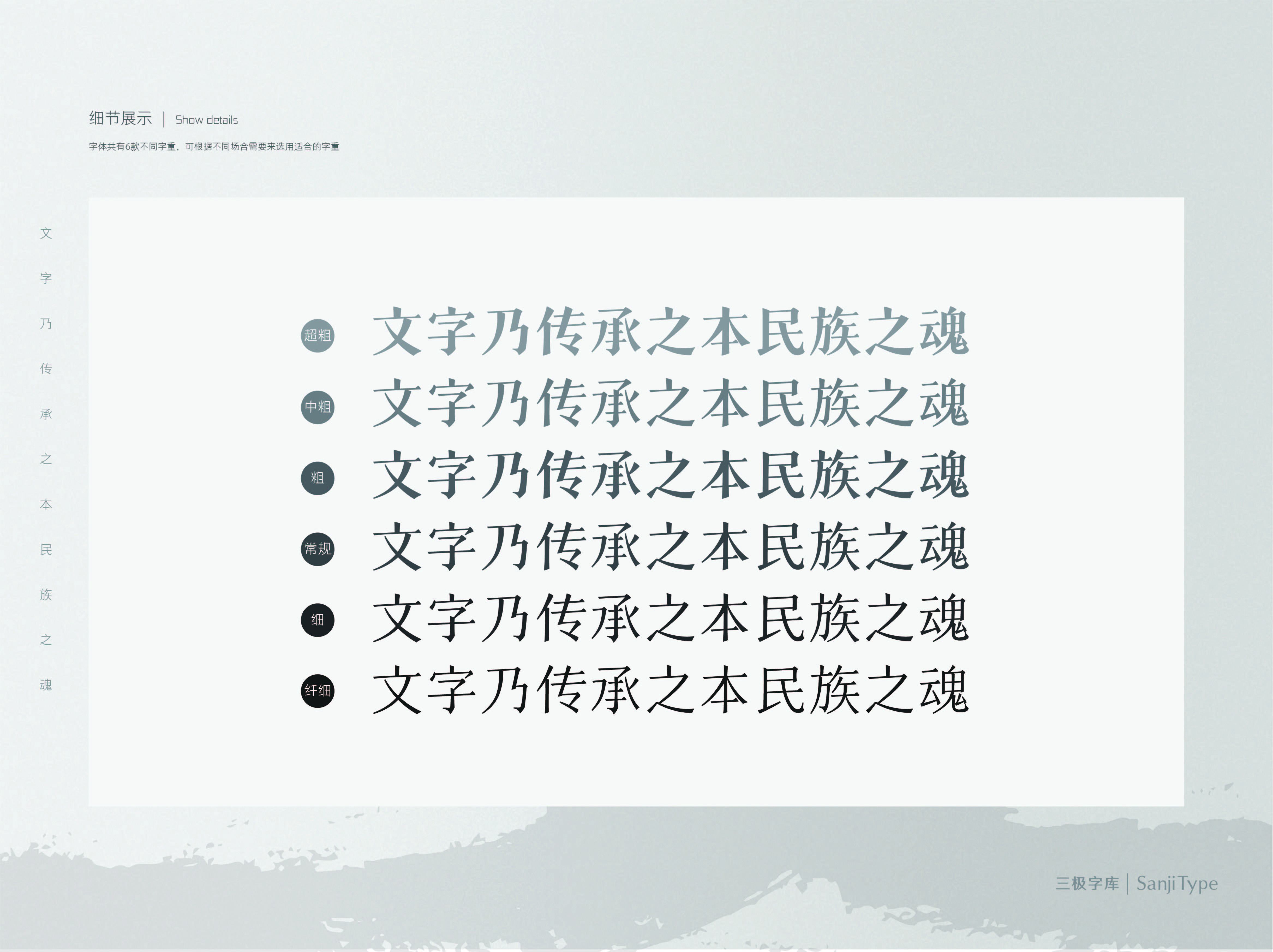 三极拙宋体家族共有六款字重,笔画源自于刻本宋,多处造型、转折带有刀刻感。横画微微倾斜,赋予字体更多的灵动性。中宫紧密,文艺气质浓厚。粗体的的横竖对比让字体更具识别性。适合海报、屏显、包装等多方面的设计应用。