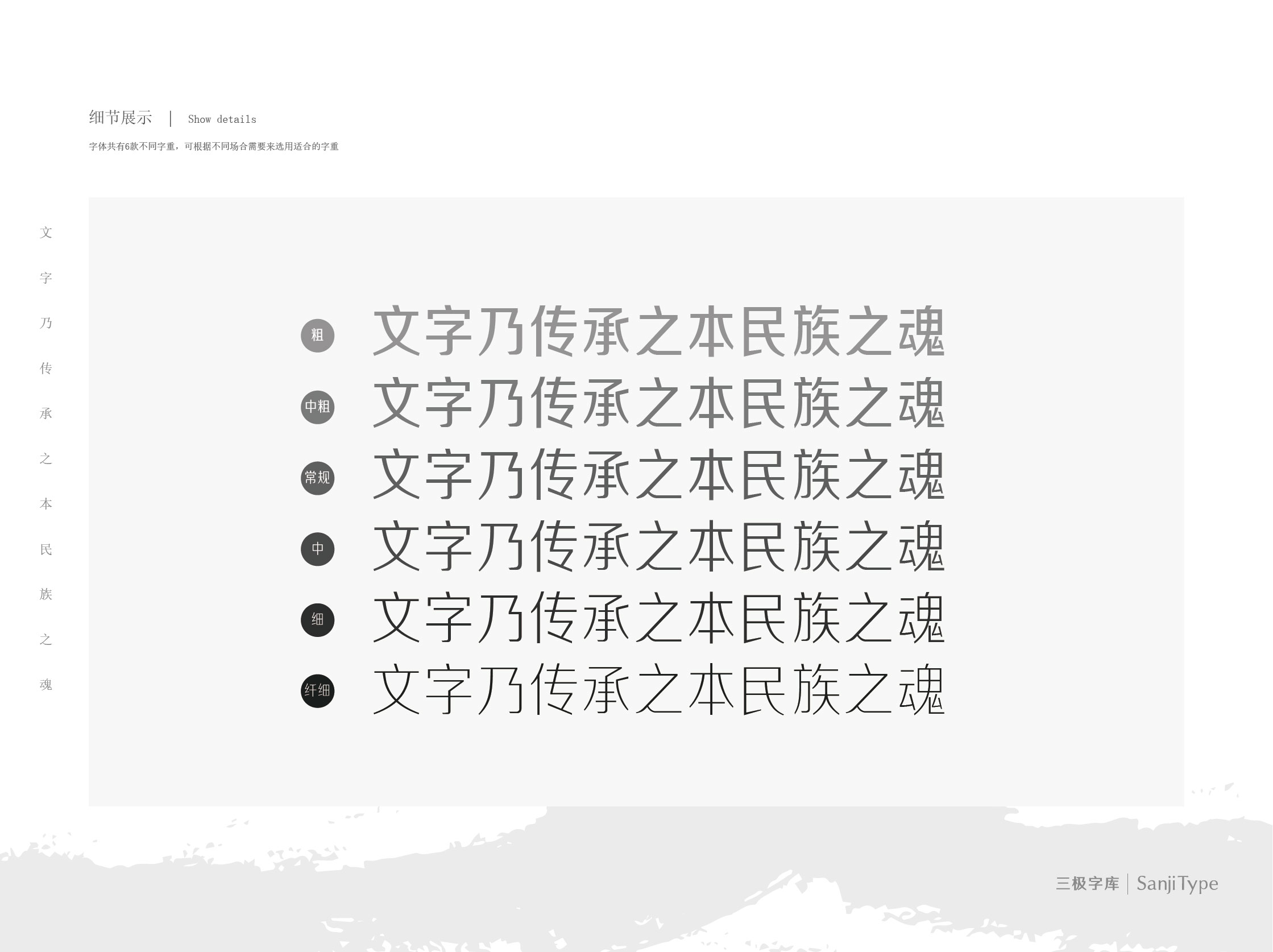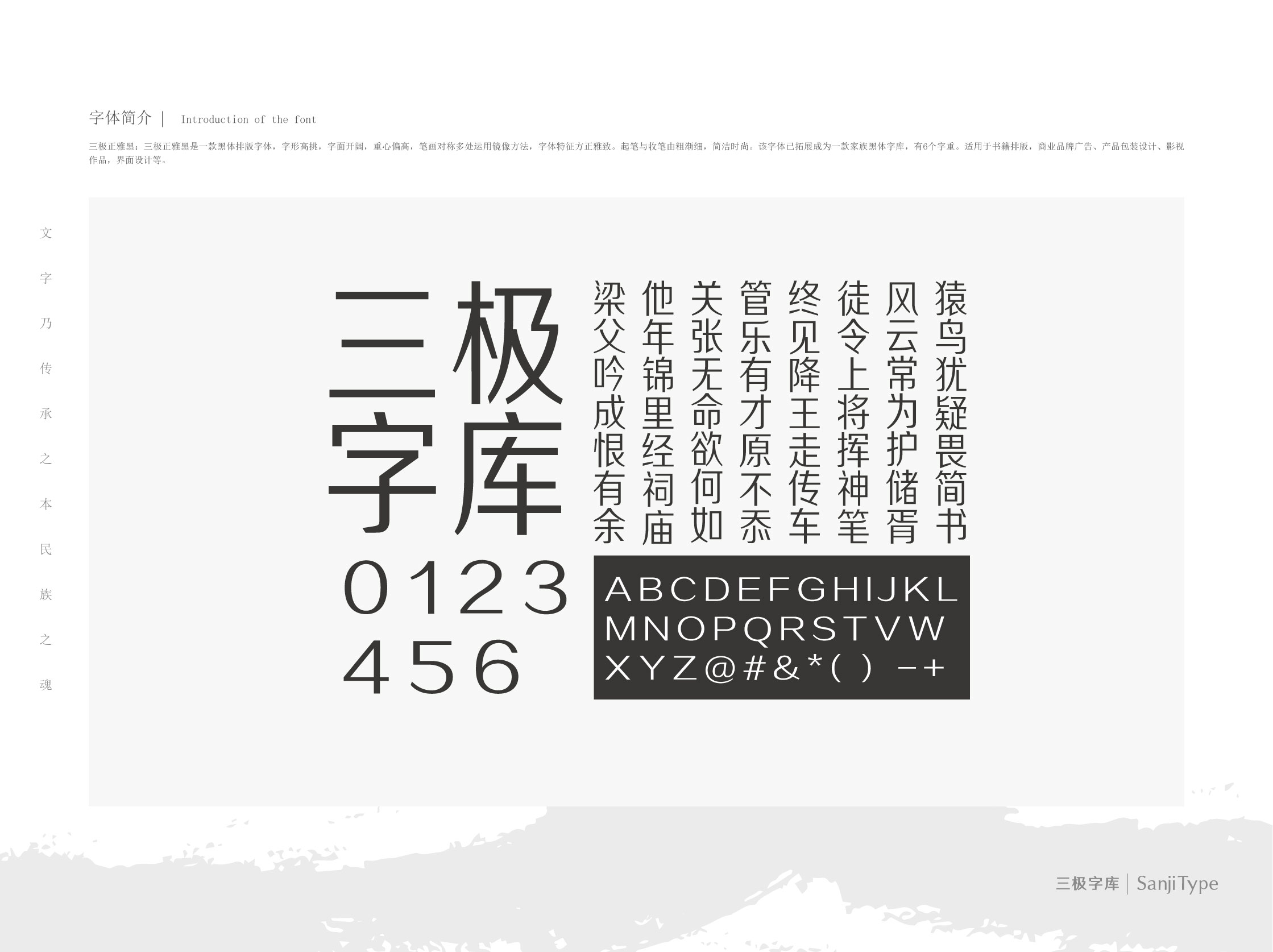 三极正雅黑是一款创新的黑体,字形高挑,字面开阔,重心偏高,多处运用镜像方法使得笔画对称,起笔与收笔由粗渐细,简洁时尚。视觉上整体方正雅致、端庄简约。该字体已拓展为一款有六个字重的家族黑体字库,适用于书籍排版,商业品牌广告、产品包装设计、影视作品,界面设计等。