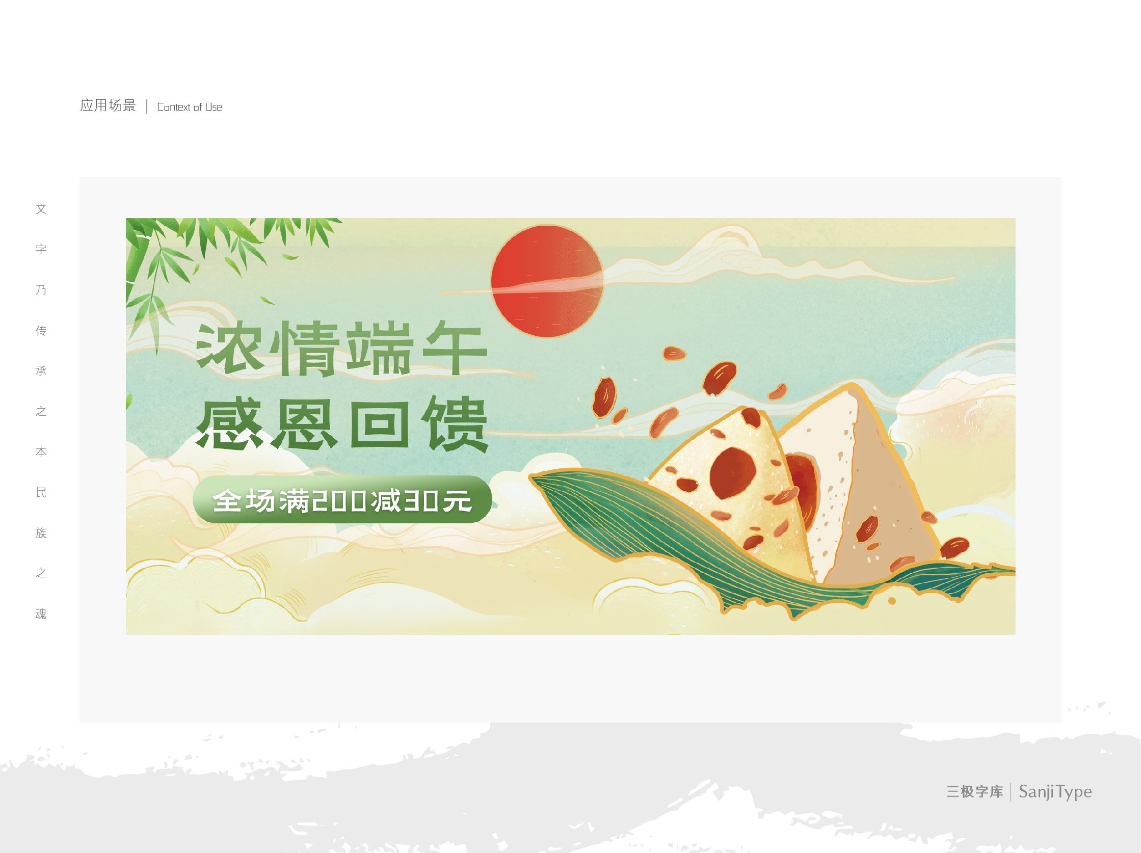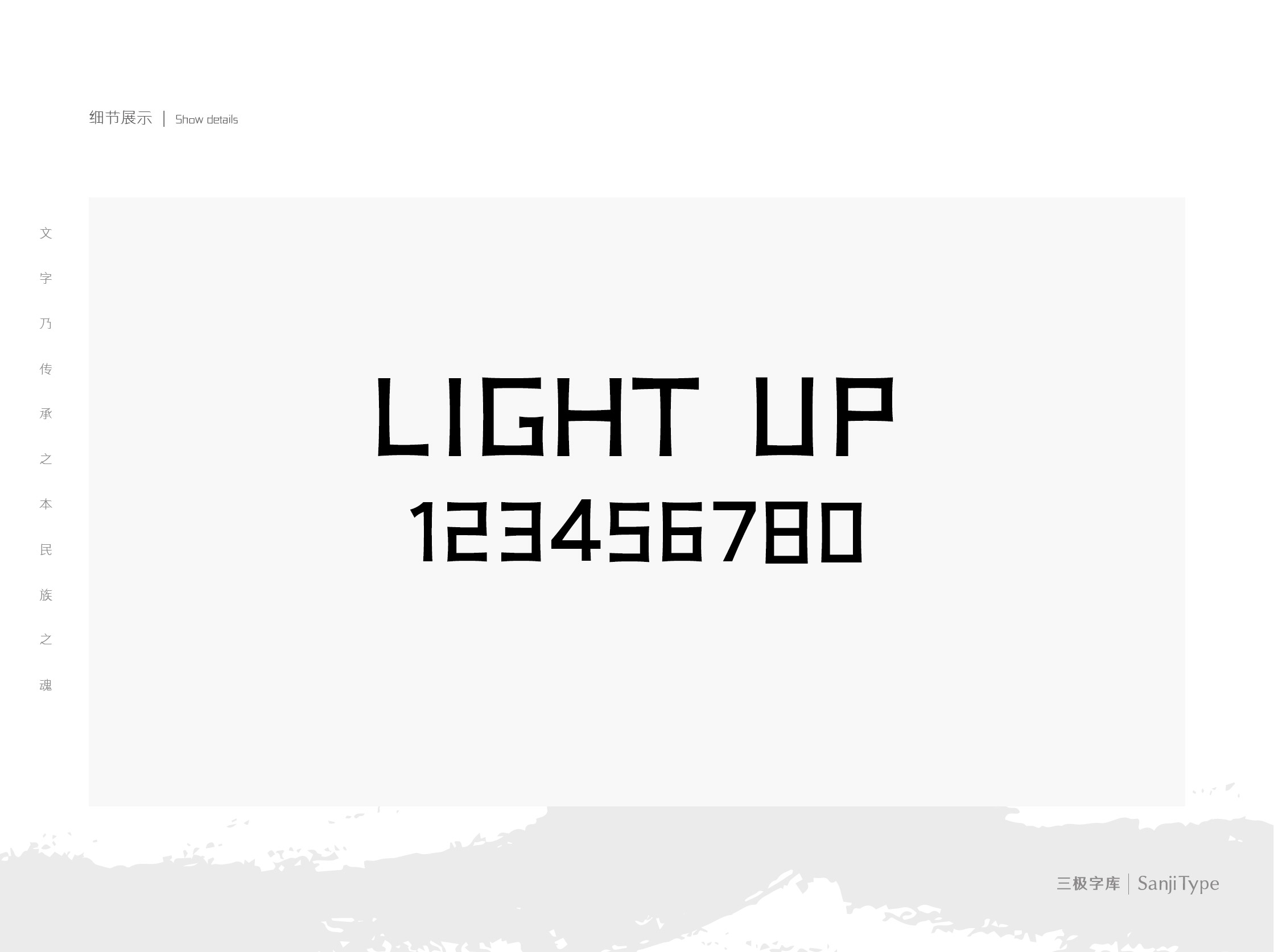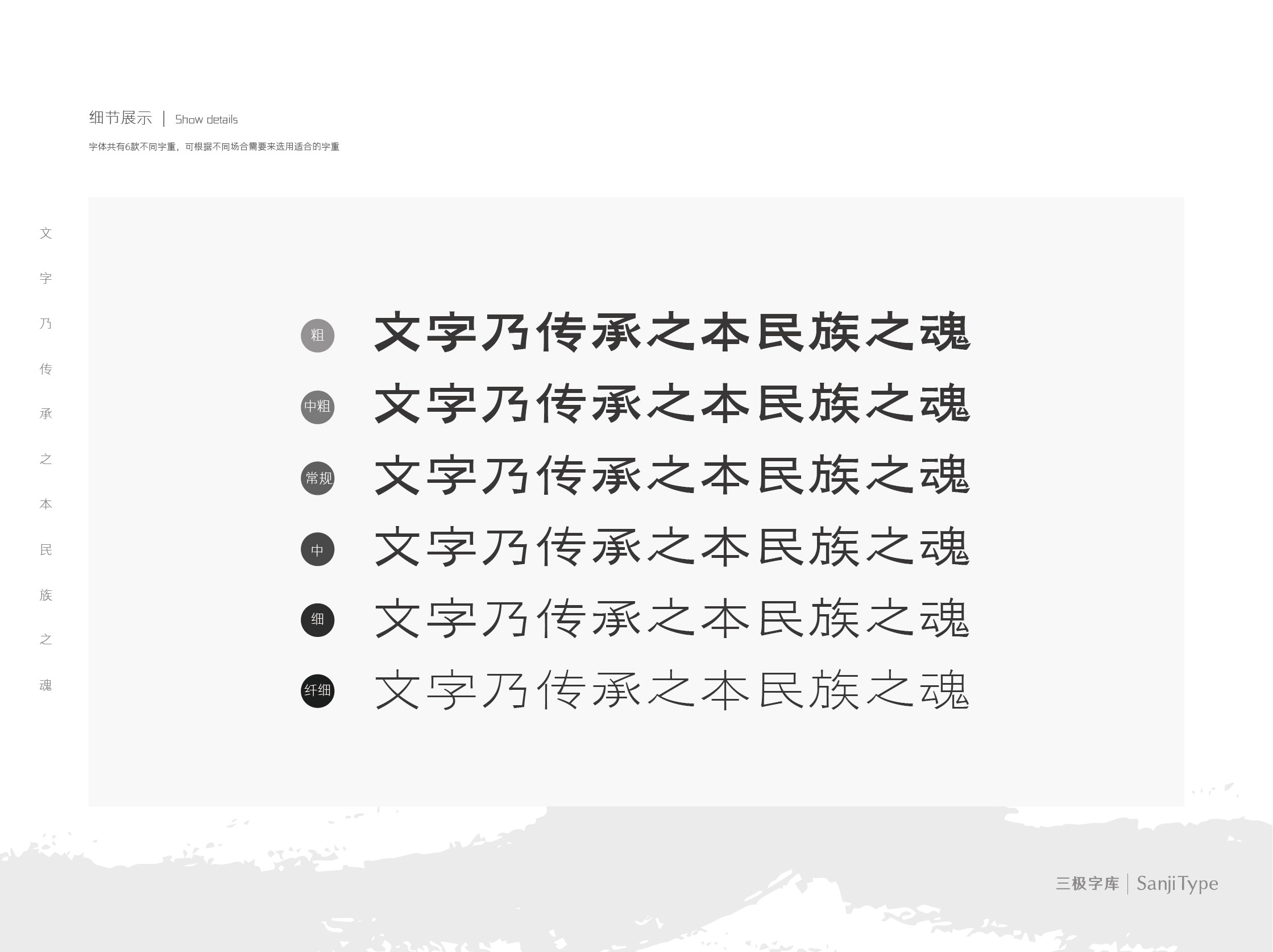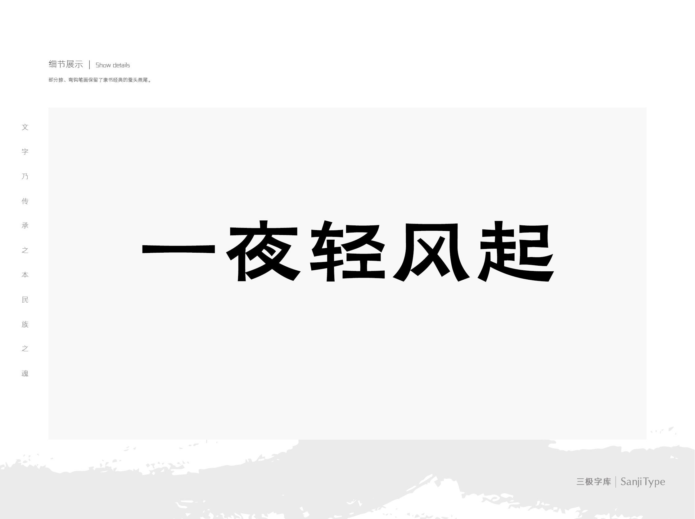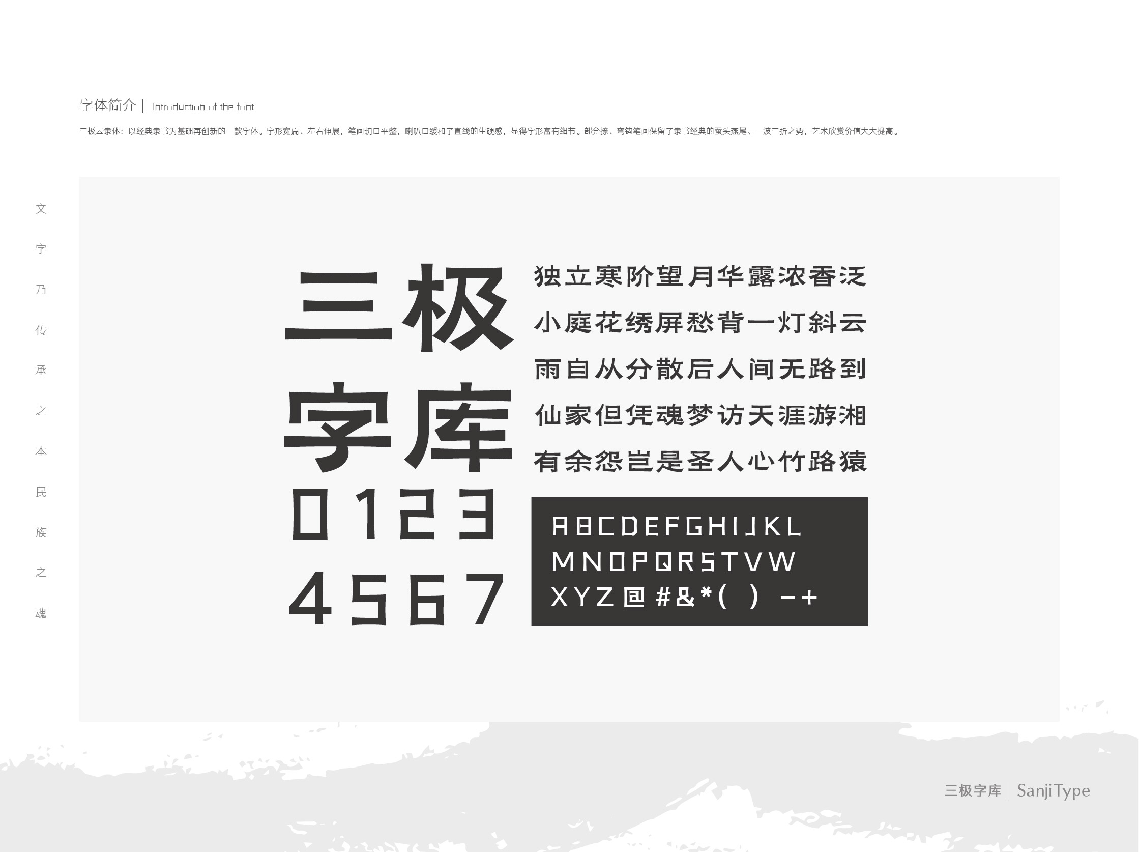 三极云隶体是以经典隶书为基础再创新的一款字体。字形宽扁、左右伸展,笔画切口平整,喇叭口缓和了直线的生硬感,显得字形富有细节。部分捺、弯钩笔画保留了隶书经典的蚕头燕尾、一波三折之势,艺术欣赏价值大大提高。该字体用于内文中规整又不失活跃感,亦适用于国潮经典、传统节日的主题排版,以及商业类品牌的广告设计。