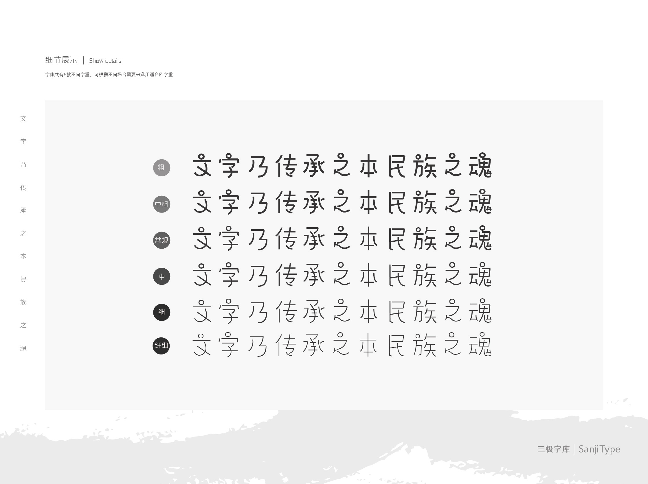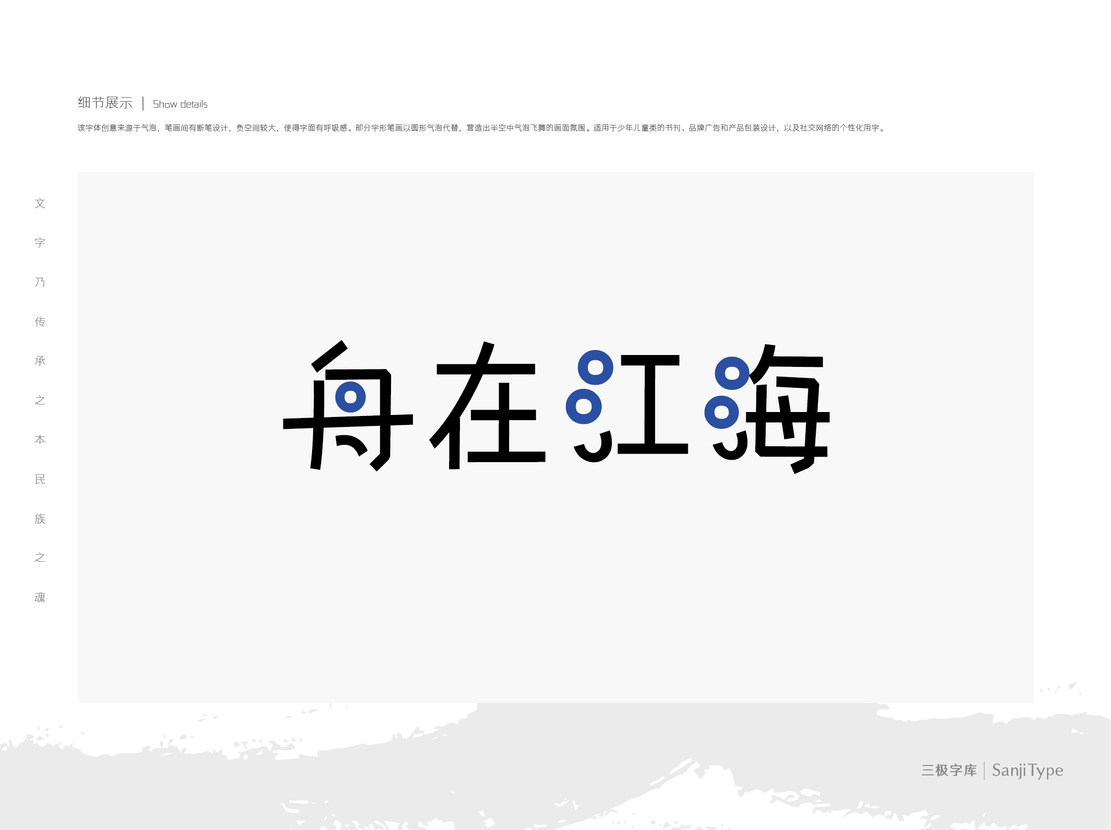该字体创意来源于气泡,笔画间有断笔设计,负空间较大,使得字面有呼吸感。部分字形笔画以圆形气泡代替,营造出半空中气泡飞舞的画面氛围。适用于少年儿童类的书刊、品牌广告和产品包装设计,以及社交网络的个性化用字。