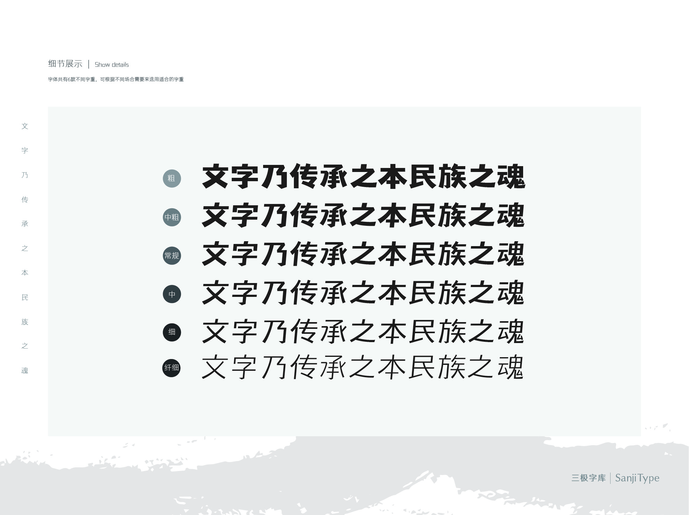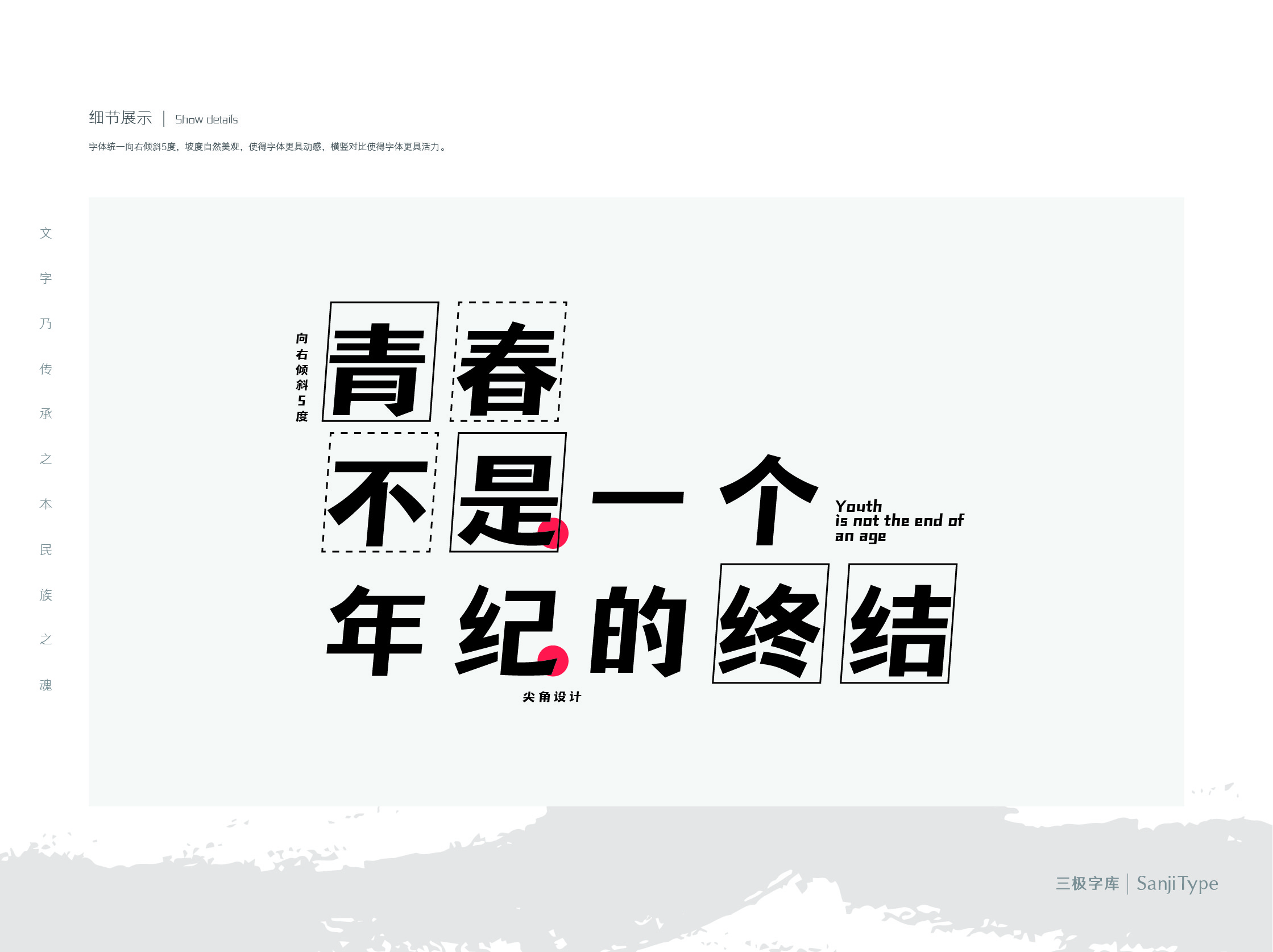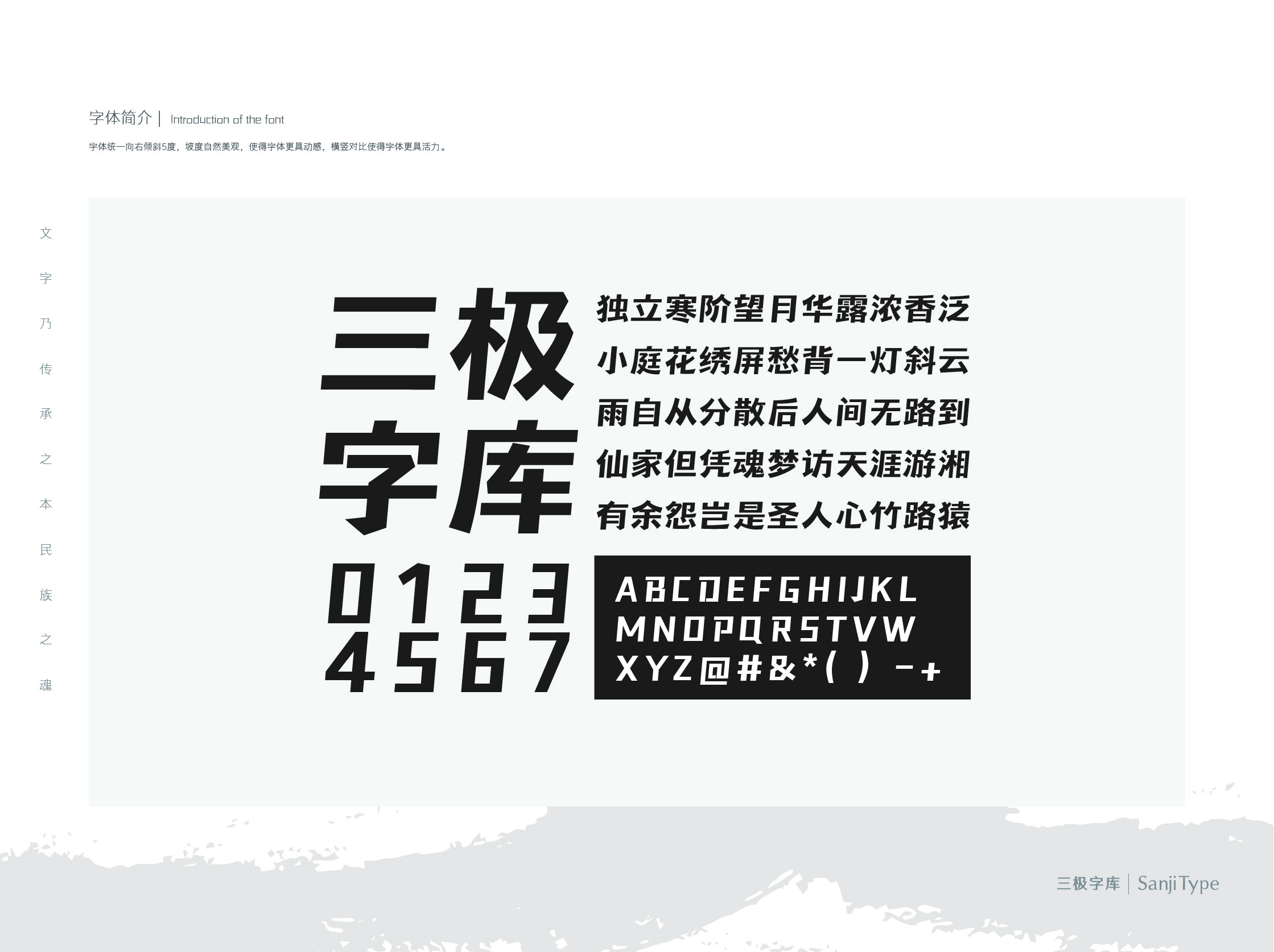 将字体统一向右倾斜5度,坡度自然美观,使得字体更具动感,横竖对比使得字体更具活力。含有六个字重,随着字重的减小,字体的横竖对比更加鲜明。在细节处,字体笔画始末两端有尖角,使得字体更加整洁。字体的字型倾斜浑厚,因此非常适合用作中文LOGO设计,也可以应用在banner设计、海报设计和 PPT 标题上。