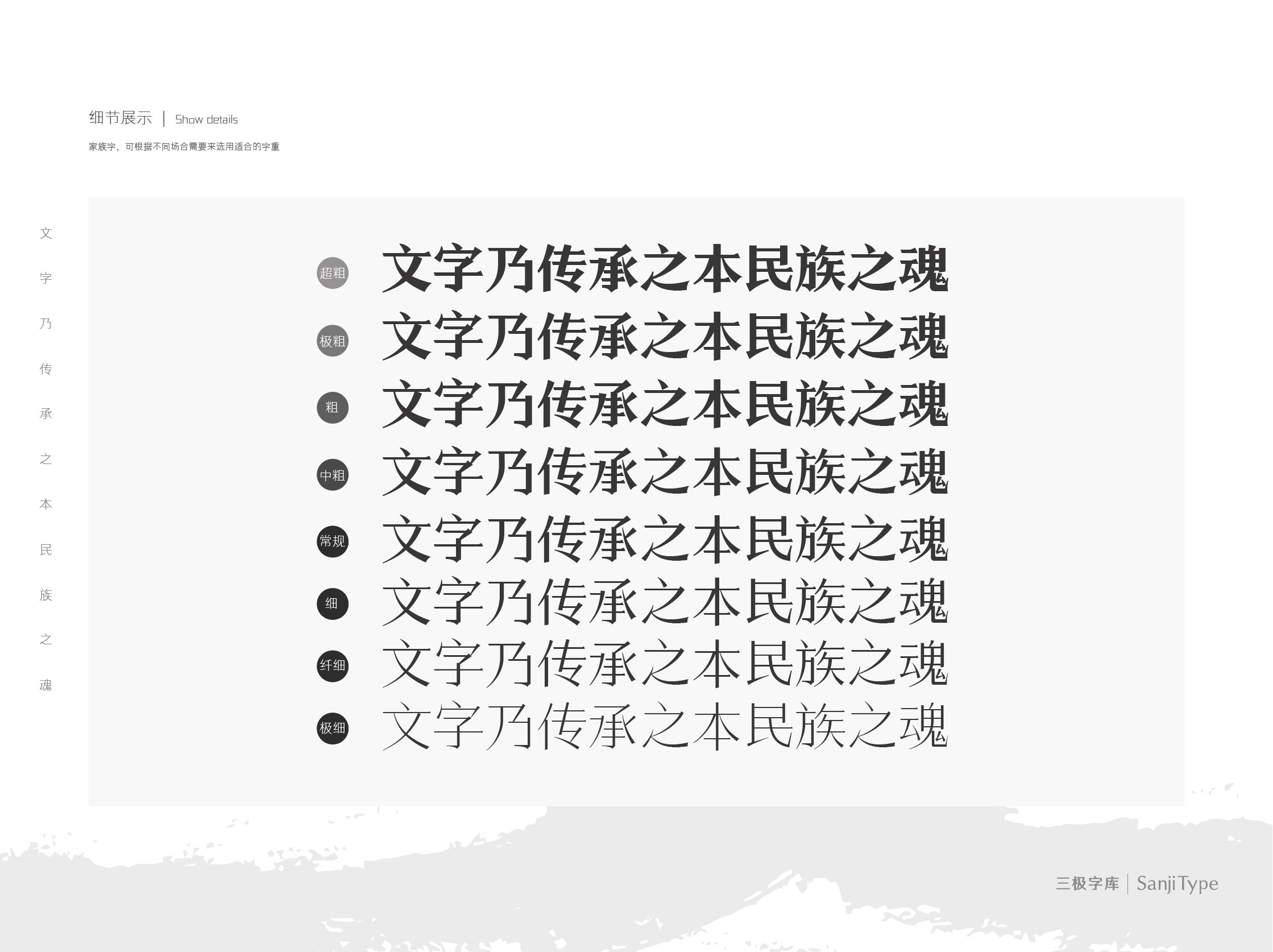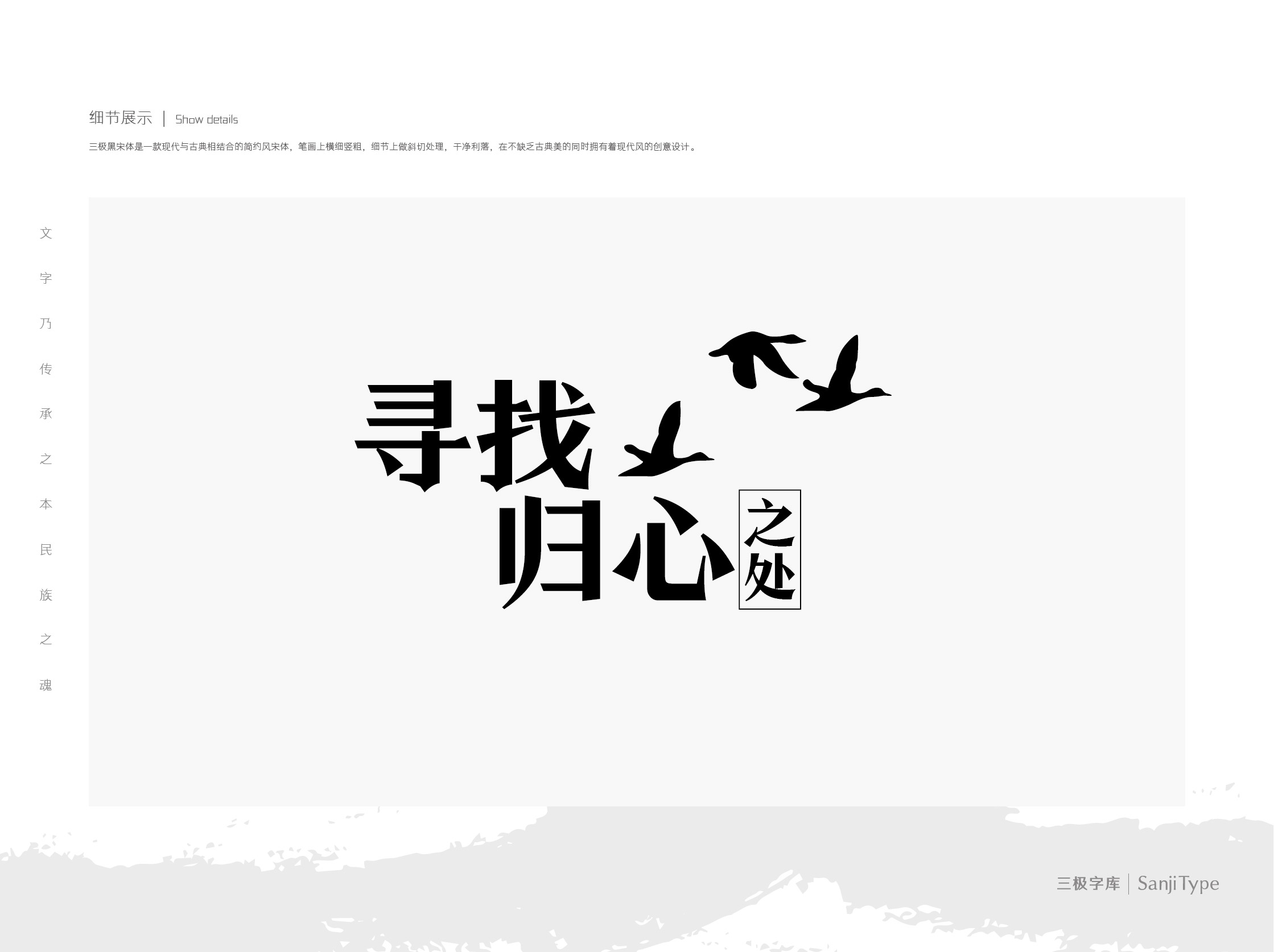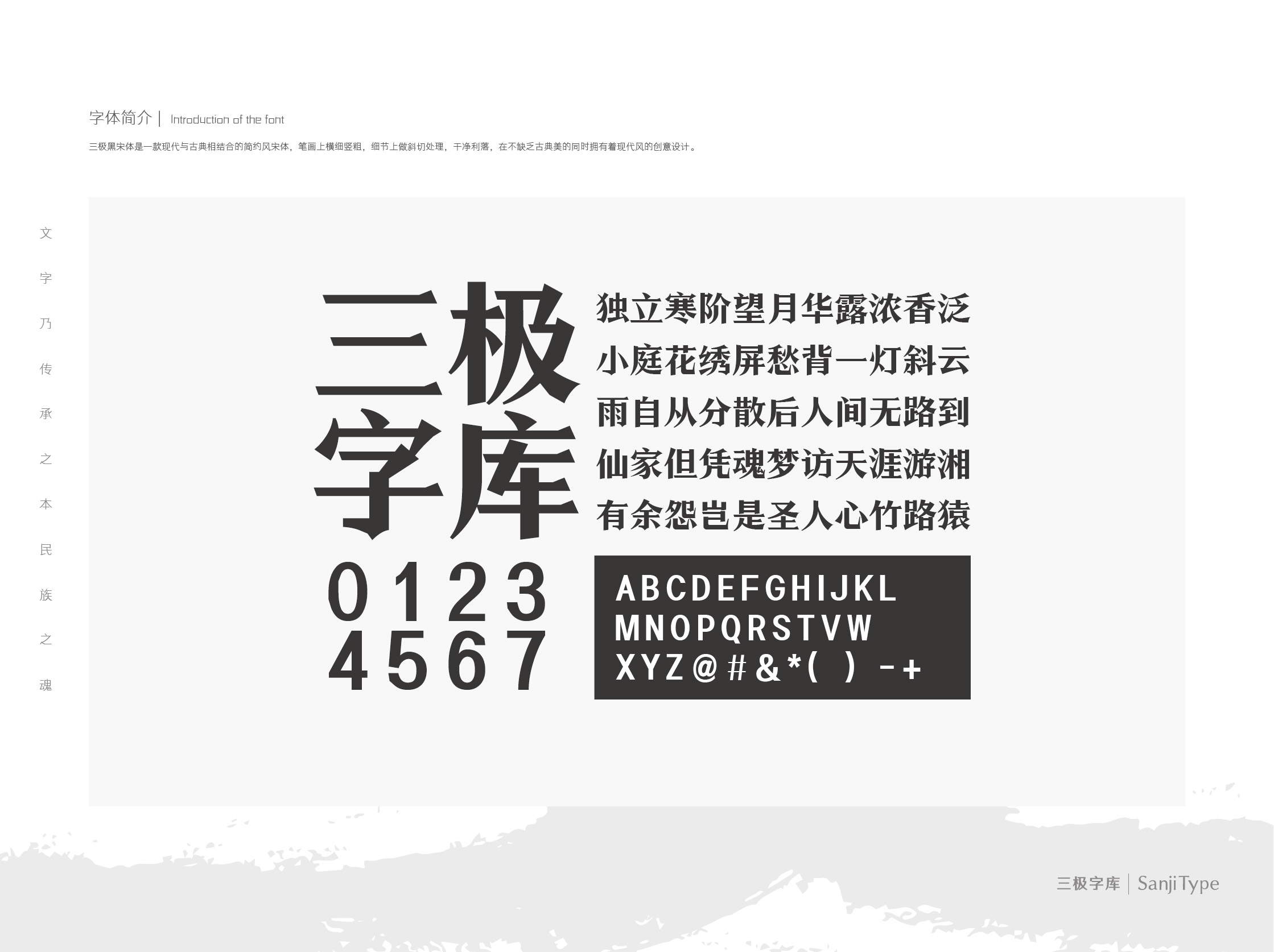 三极黑宋体是一款现代与古典相结合的简约风宋体,笔画上横细竖粗,细节上做斜切处理,干净利落,在不缺乏古典美的同时拥有着现代风的创意设计。此字体使用于书刊、品牌广告和产品包装设计,以及社交网络的个性化用字。
