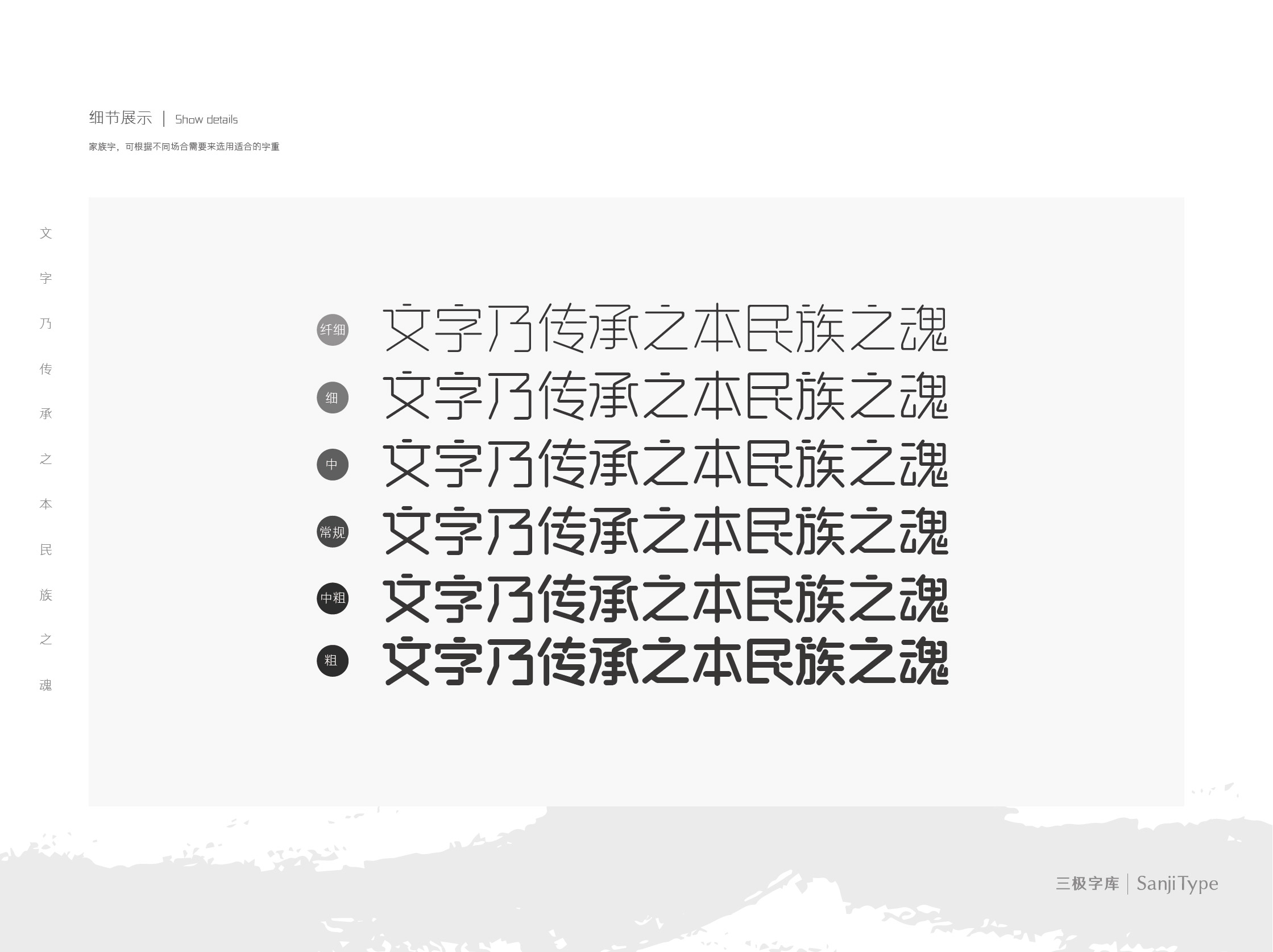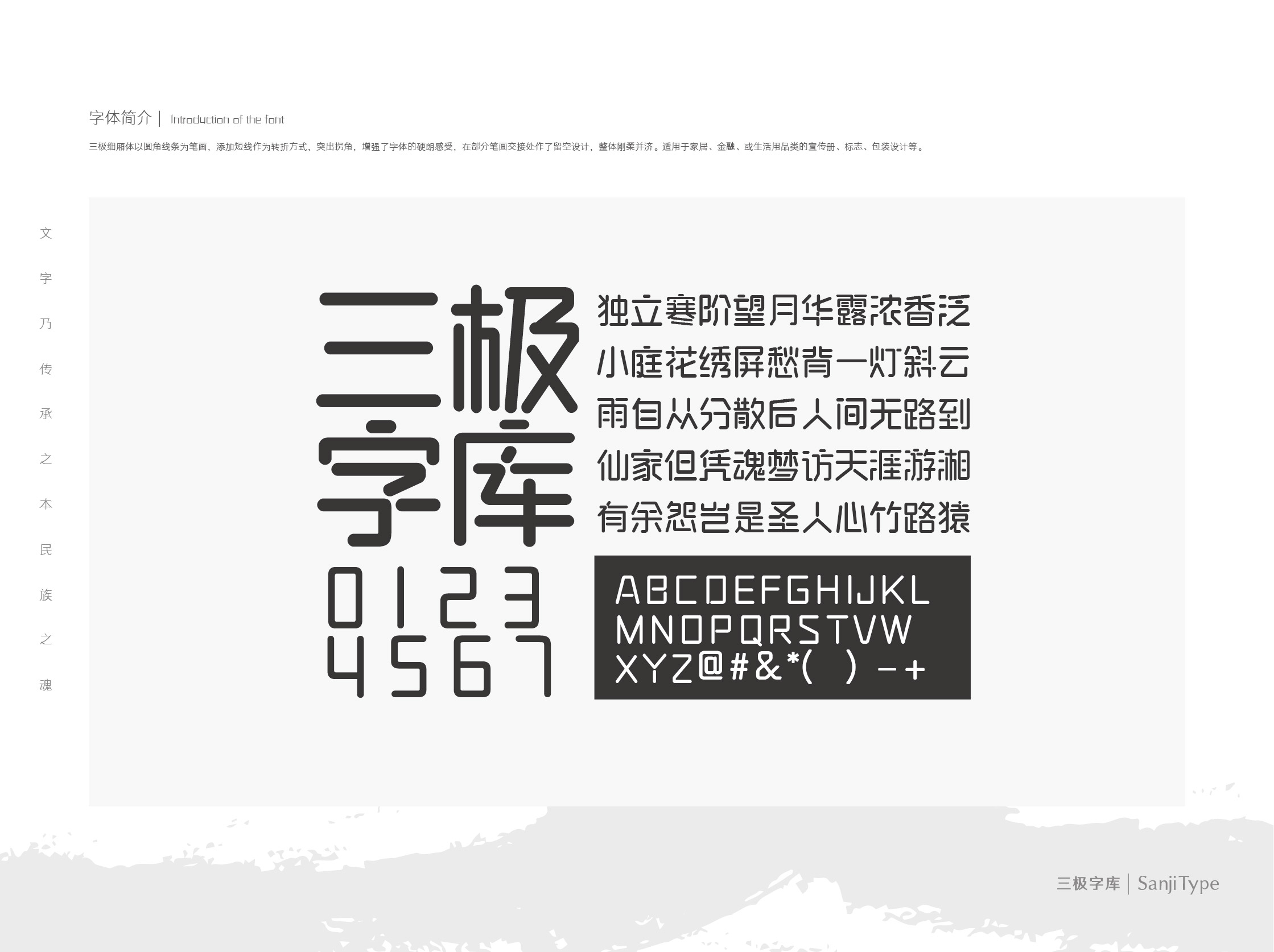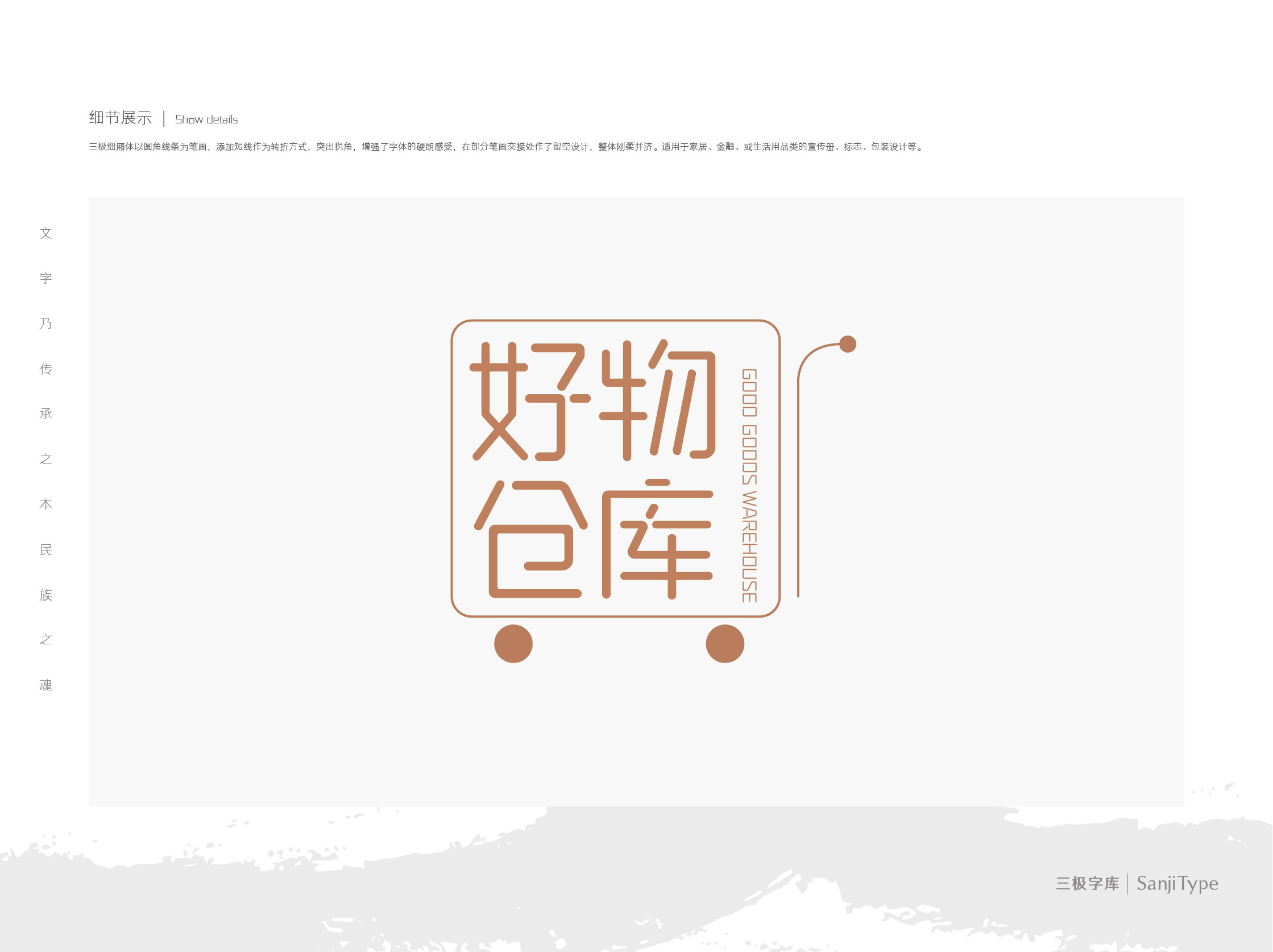 三极细厢体以圆角线条为笔画,添加短线作为转折方式,突出拐角,增强了字体的硬朗感受,在部分笔画交接处作了留空设计,整体刚柔并济。适用于家居、金融、或生活用品类的宣传册、标志、包装设计等。