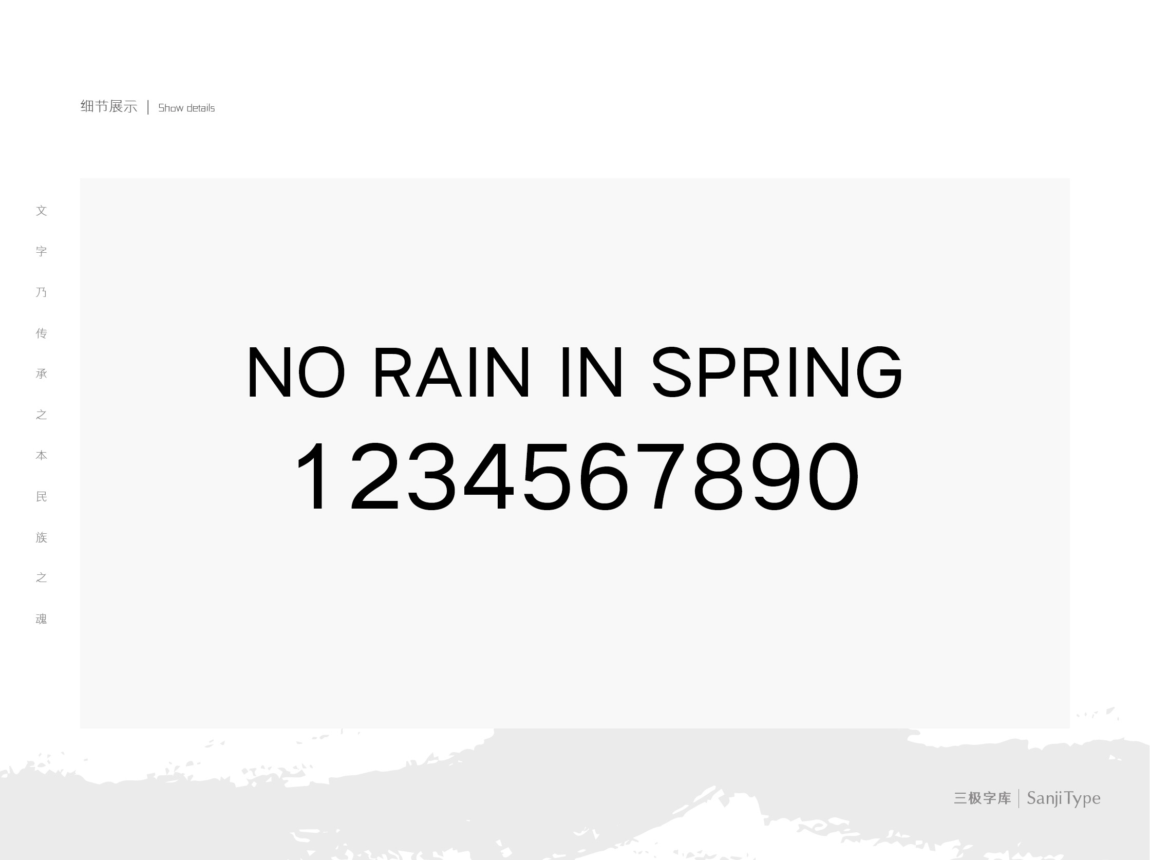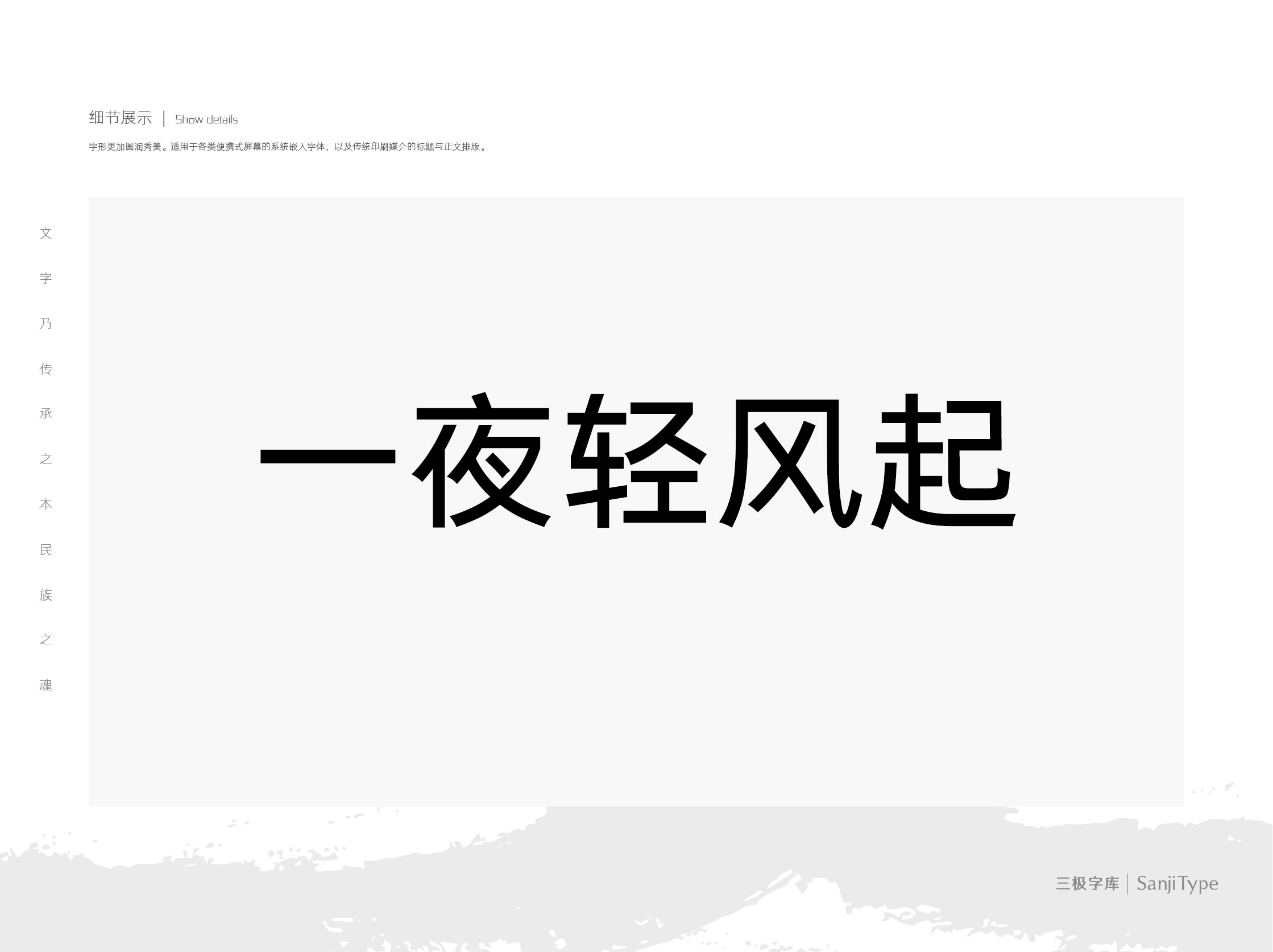三极典黑简体是一款家族字体,字形清新,结构严谨,布白均匀,中宫偏大,重心一致。适当缩小字面大小、加大默认字距、增强了字体的识别性,使得版面更加通透明了。字形更加圆润秀美。适用于各类便携式屏幕的系统嵌入字体,以及传统印刷媒介的标题与正文排版。在品牌形象设计中作为logo设计辅助描述性文字视觉效果更佳。