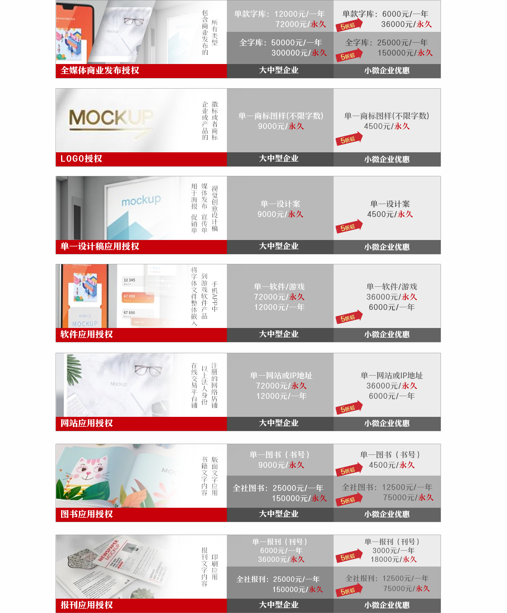 1、 全媒体商业发布授权模式,包括以上全部授权类型及使用范围,且不限制设计稿数量、印量和发布次数。但限定为集团公司企业旗下单一子品牌、子公司或产品线。若用户想为整个集团统一购买,则需根据旗下机构或品牌数量另行洽谈。 2、 设计案发布授权模式,主要指针对单一视觉创意设计稿。若设计稿数量增加,则需要累计计算。大于等于两个设计稿,则按照单一设计稿授权价格2倍计算。单一设计稿超过2款字体,按照1款字体单一设计稿授权价格2倍计算。 3、 官网发布主要指被授权企业的官方网站用字,不限设计稿数量,但限定为单一企业域名。若域名为多个,按照单个域名授权价格2倍计算。 4、 VI类主要指企业标志设计、企业标准字体、企业宣传册、企业造型(吉祥物)、企业象征图形、企业专用印刷字体等形式的应用。 5、 上述授权类型均无应用印量、发布次数的限制。若实际应用中有特殊情形的,价格可有所浮动。 6、 上述价格不包括将被许可字库对应的电子文件整体或部分直接或格式转换后,以嵌入的方式应用到网站、计算机程序或带有可视化显示功能的电子产品中的使用方式。嵌入式应用常见的涉及信息处理的软件产品和嵌入式系统包括:桌面操作系统(Windows、Mac、Linux、Unix等)、具有文字处理功能的软件(Office、CAD、OA等)、打印输出设备(Printer) 、手机(Mobile Phone)、电子书(eBook)、电子字典、机顶盒(Set top box)、导航仪(Navigator、GPS)、数字电视系统(Digital TV)、车载娱乐终端(Car dvd entertainment system)、医疗系统、工业控制系统等。具体可致电象码字库客服人员服务电话是:020-32038330 7、 对象码字体有使用需求的非营利性公益活动,活动主办方可向象码字库提出申请。象码字库将对审核通过的活动主办方出具授权书,授权其在所申请的活动中免费使用已正式上市的象码字体。